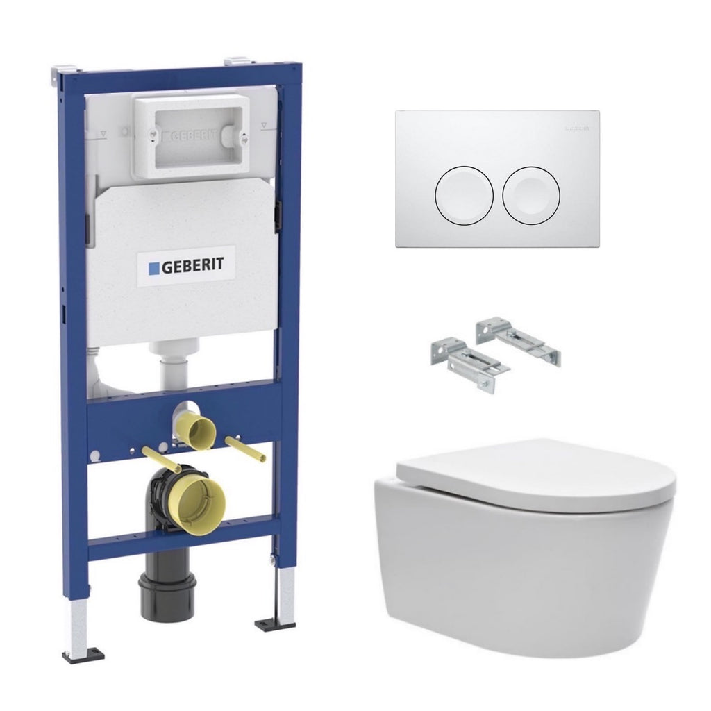 • Oprema - Podometni splakovalnik Geberit Duofix Delta 458.103.00.1 s kompletom  stenskih sider za posamezno montažo Geberit Duofix, bela aktivirna tipka Geberit Delta25 115.125.11.5, zvočna izolacija VLOZKAWC, viseča brezrobna WC školjka SAT Brevis SATBRE010RREXP z WC desko s počasnim zapiranjem in sistemom EASY Lock