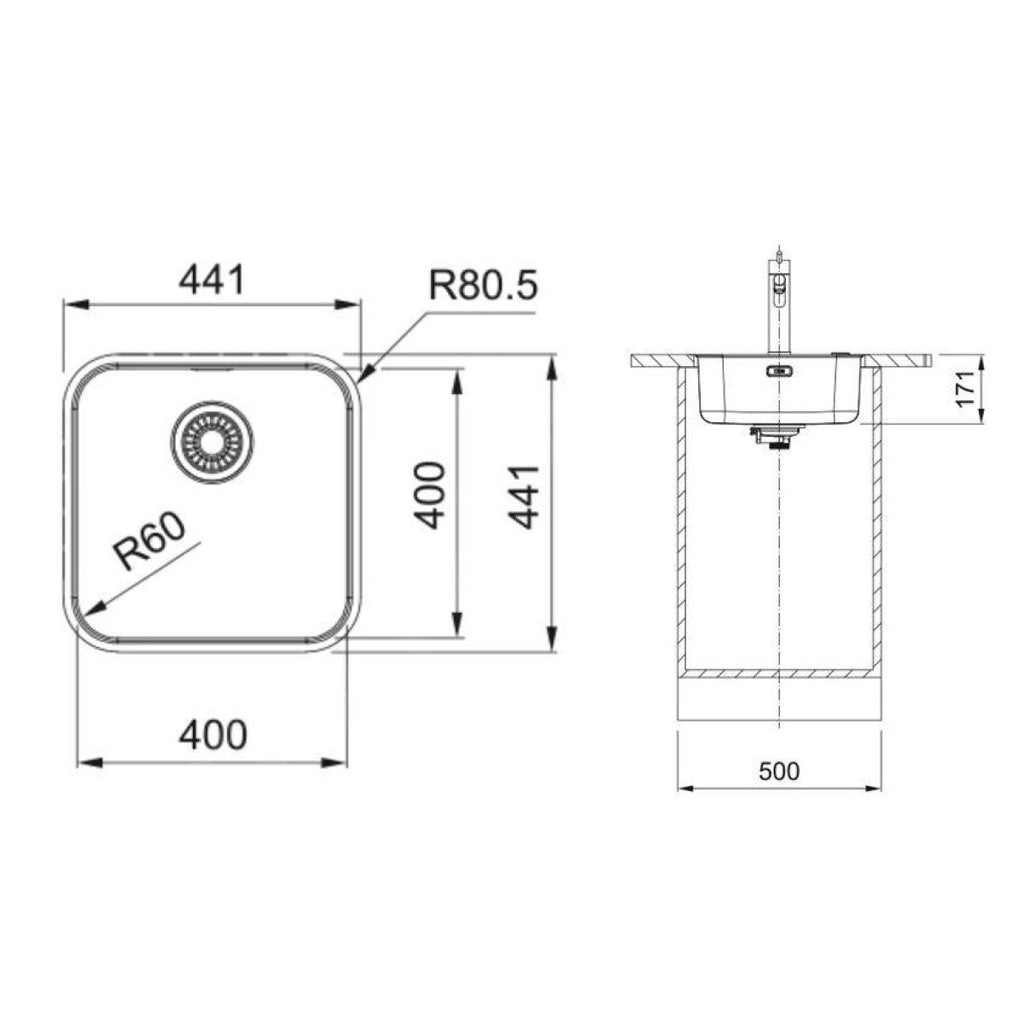 Kuhinjsko pomivalno korito iz nerjavnega jekla. Ustreza za vgradnjo v omarico 500 mm.