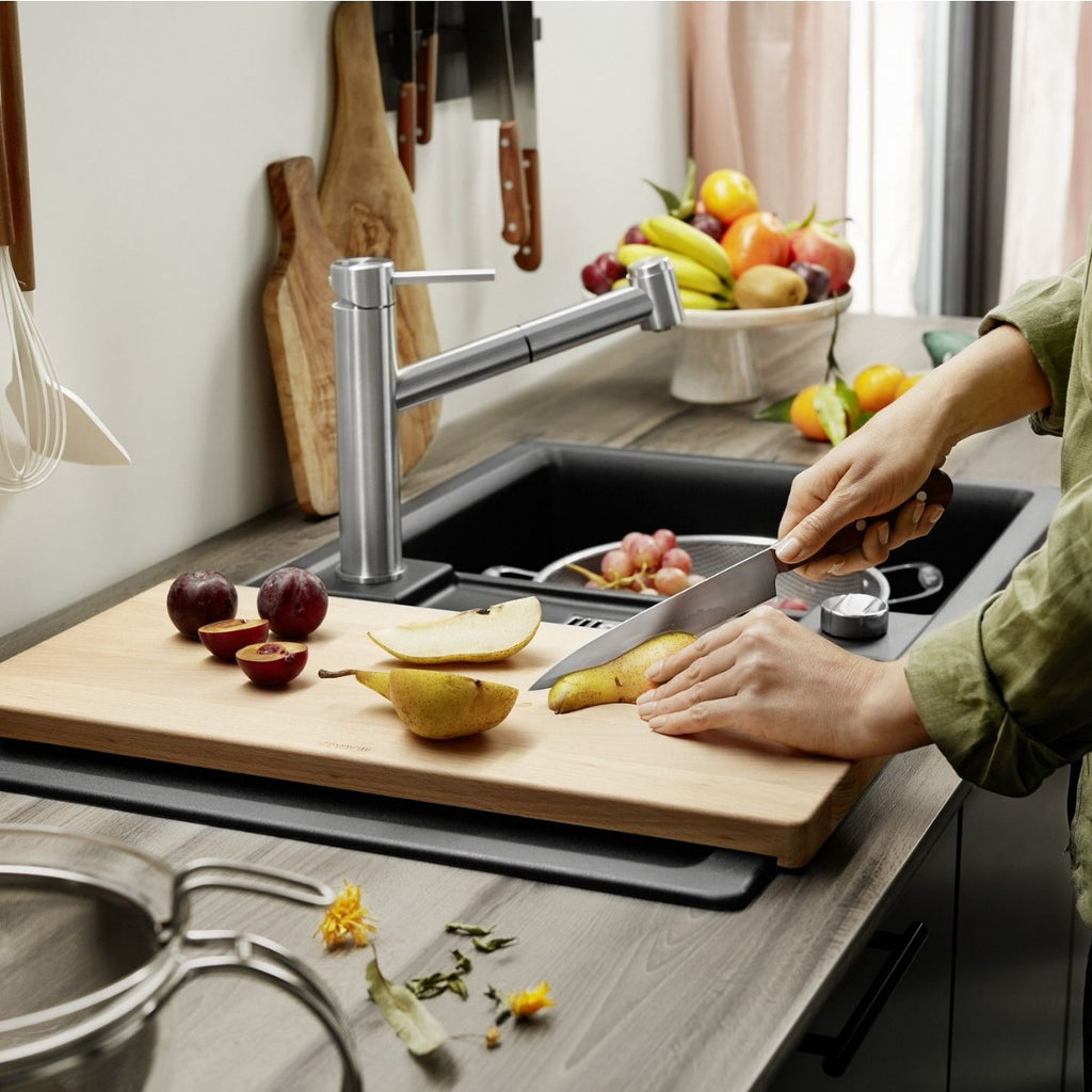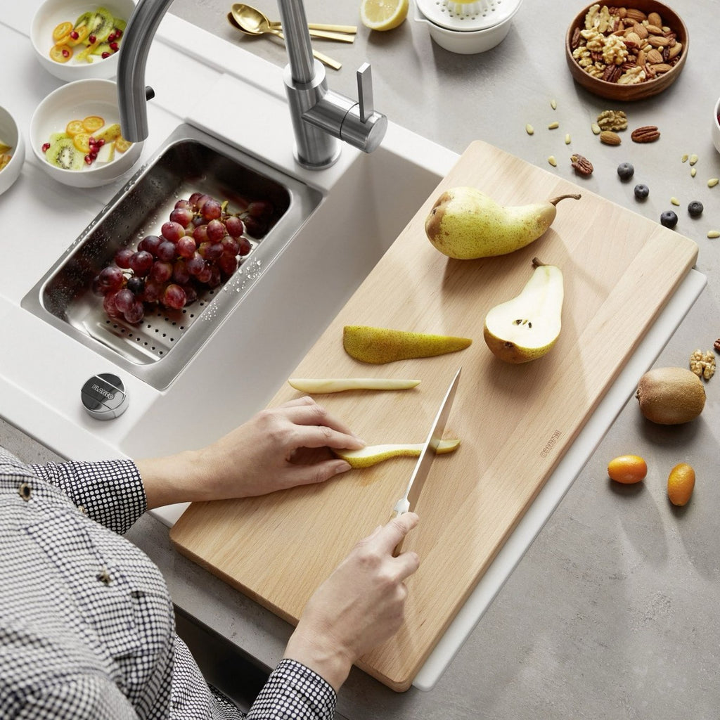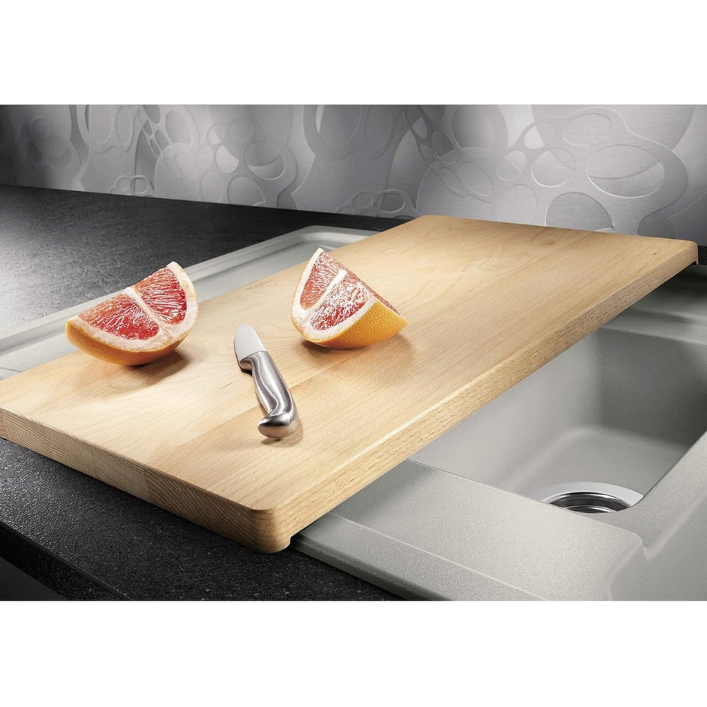 Priročna deska za rezanje iz masivnega bukovega lesa. Zasnovano za postavitev nad pomivalno korito. Primerno za pomivalna korita širine 50 cm. s klasično nadpultno namestitvijo.