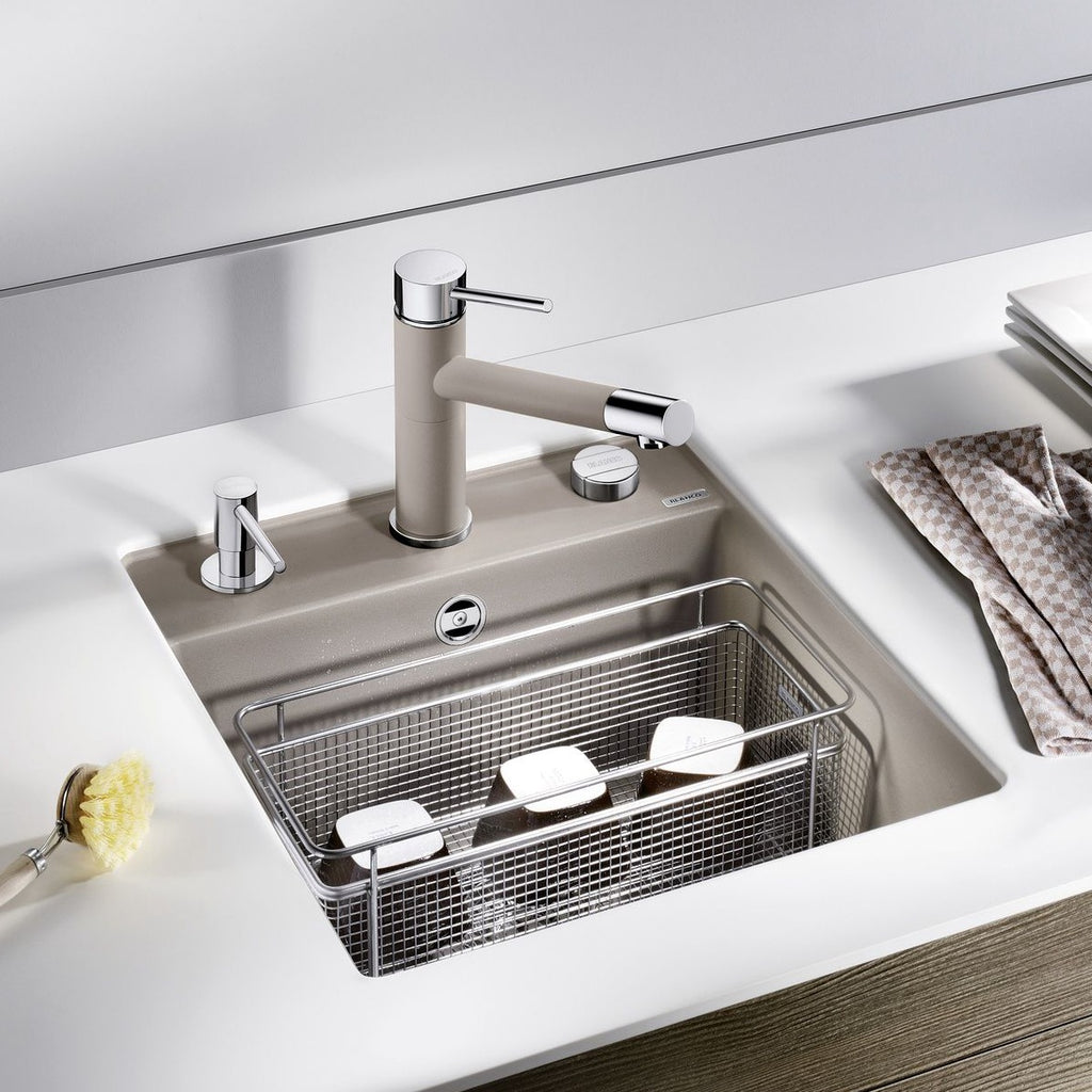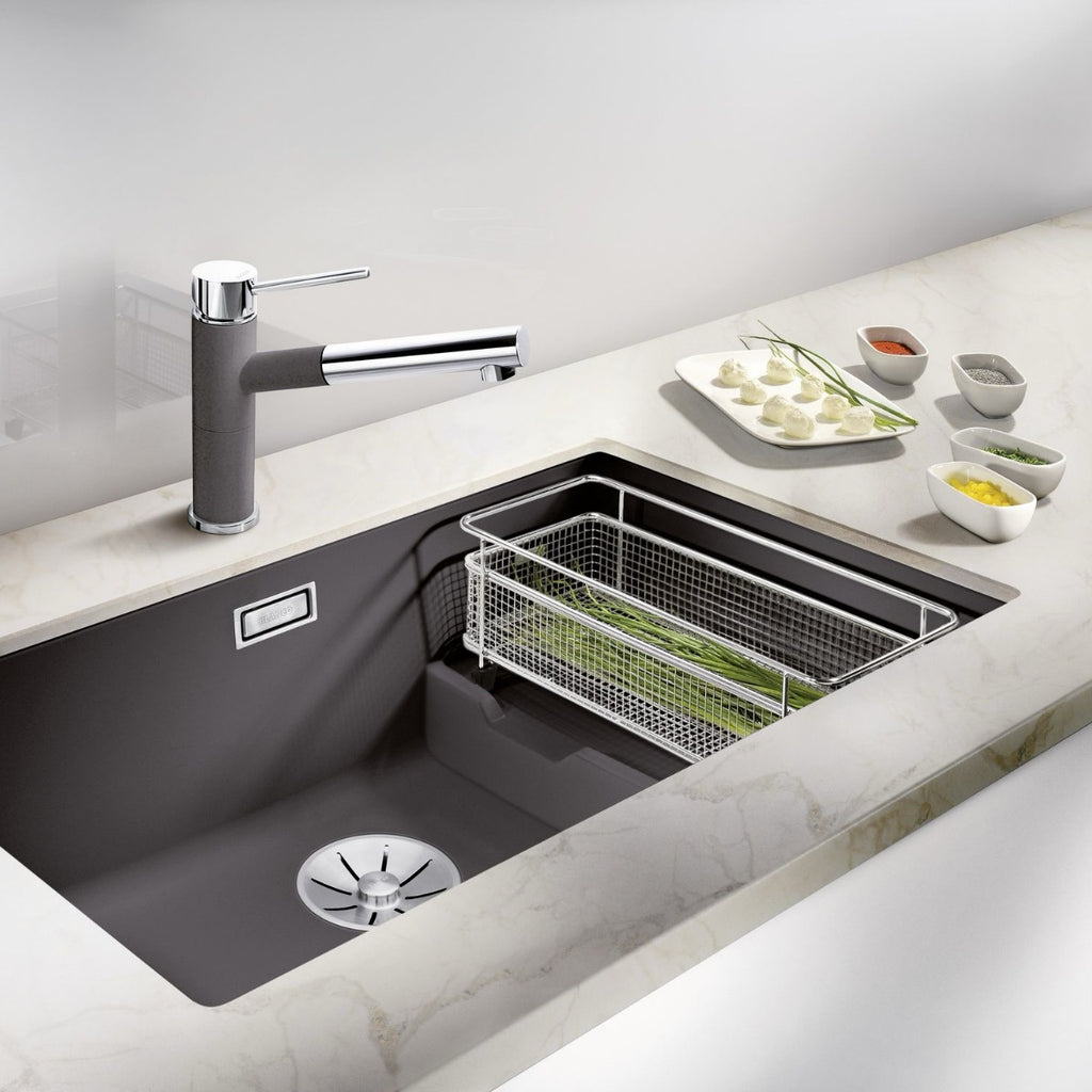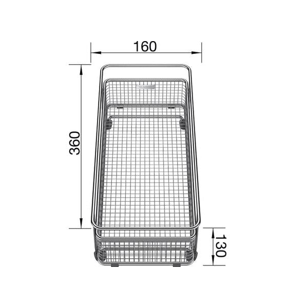 Univerzalna žična košara iz nerjavečega jekla z dimenzijami 360 × 160 x 130 mmNamenjena uporabi z BLANCO koriti serije SUBLINE.