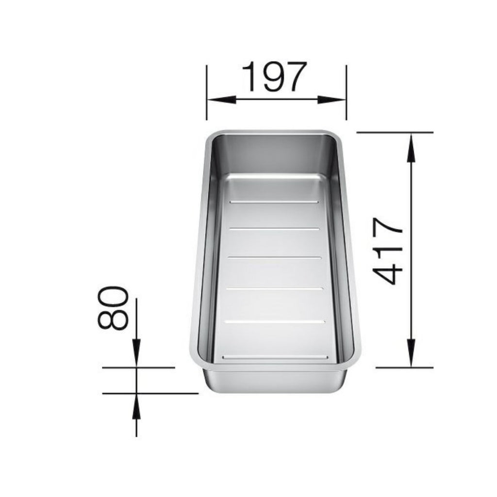 Odcejalna posoda iz nerjavečega jekla s dimenzijami 417 × 197 mm. Idealna za izpiranje, odcejevanje zelenjave, sadja ali testenin. Namenjena uporabi z BLANCO koriti iz nerjavnega jekla, serije ETAGON, ANDANO ali SUPRA.