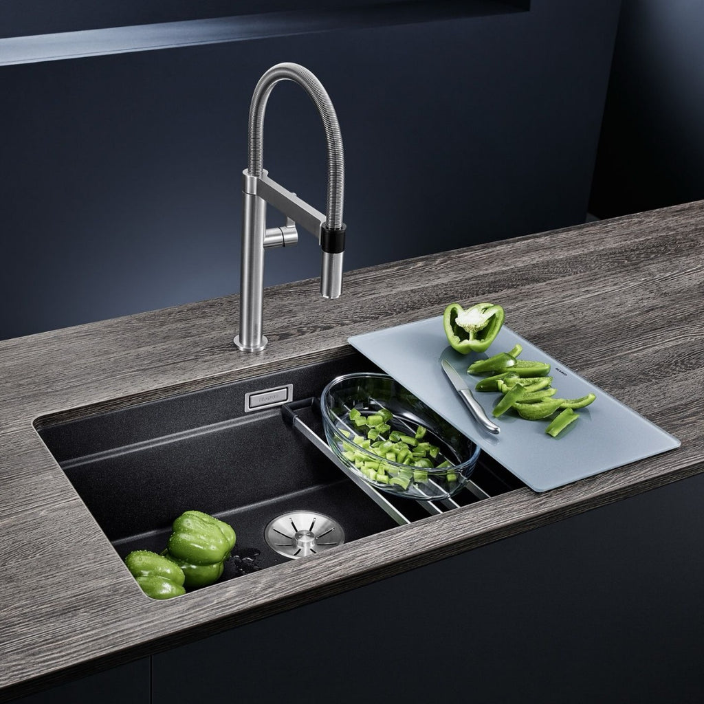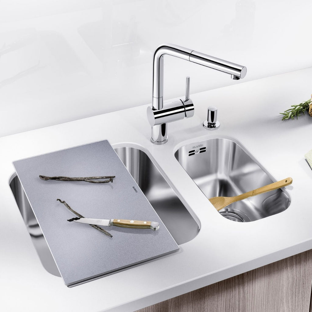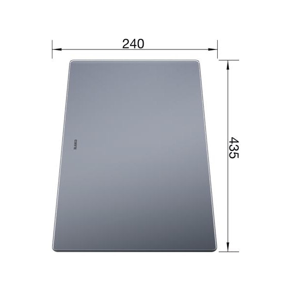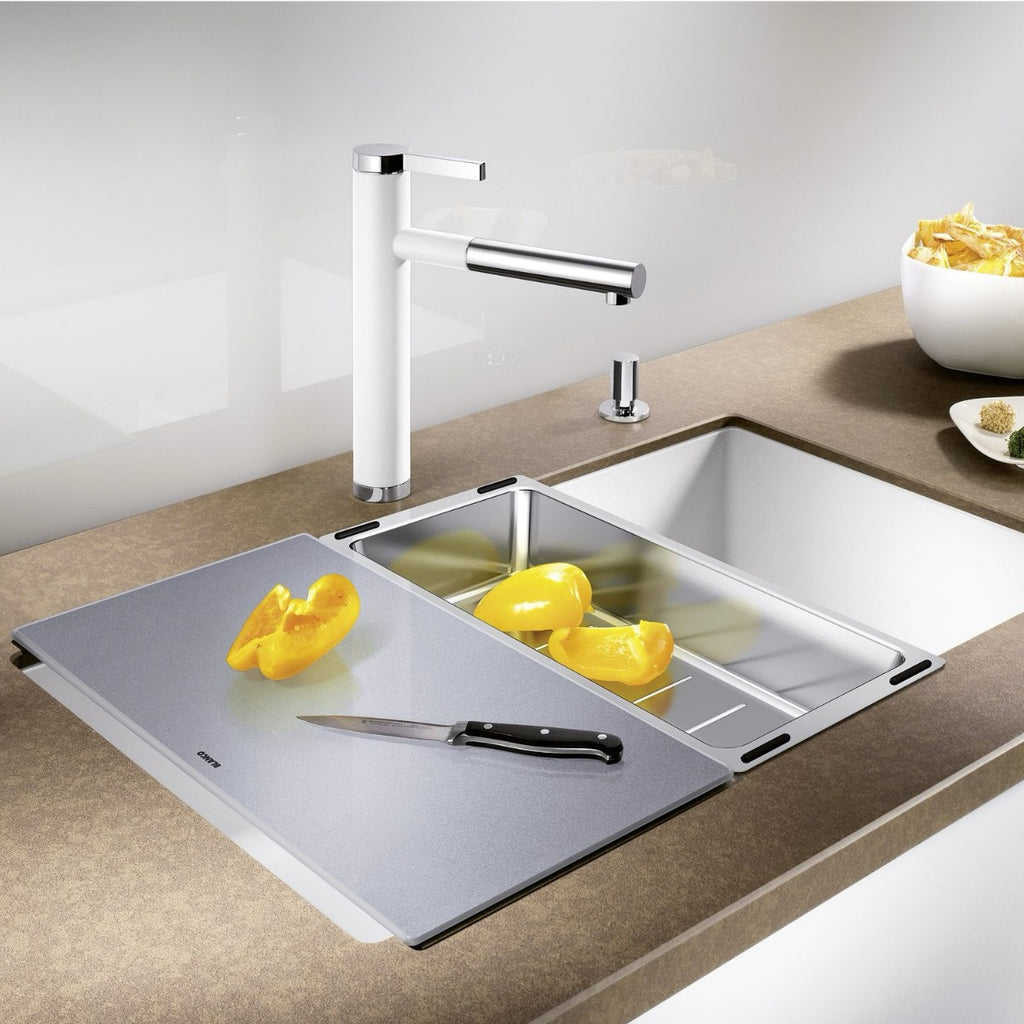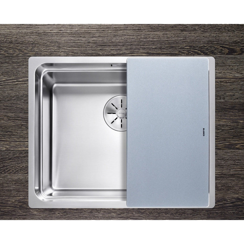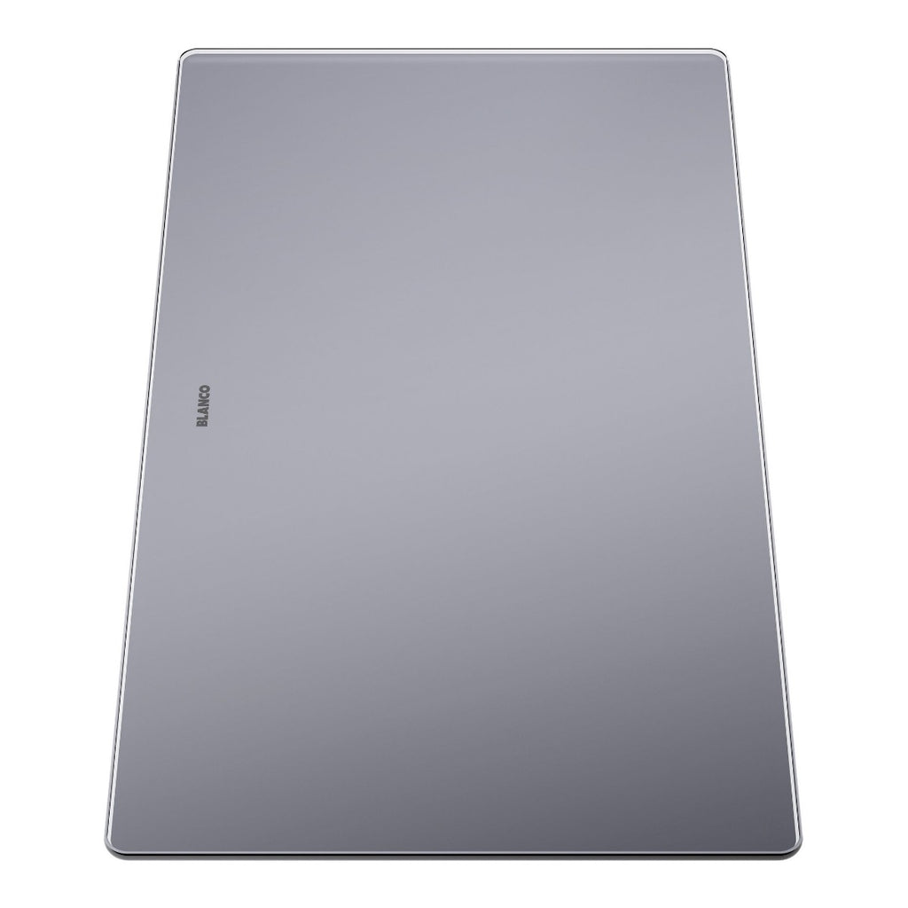 Razkošna steklena deska za rezanje srebrne barve. Primerno za pomivalna korita BLANCO s podpultno ali vsadno namestitvijo serije ANDANO ali SUBLINE.
