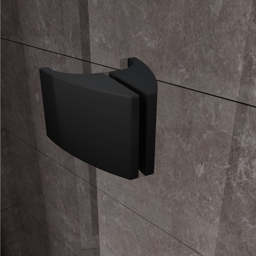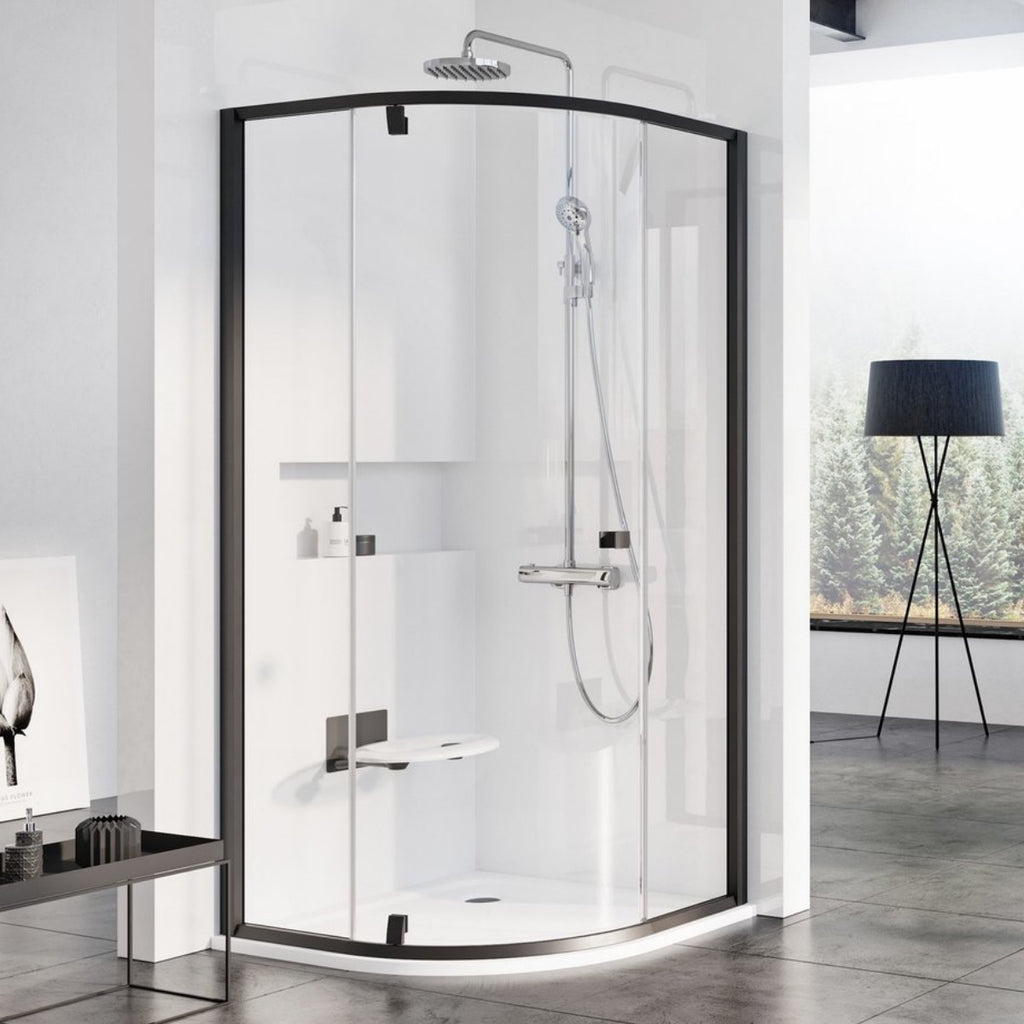 Polkrožna tuš kabina z vratnim krilom na tečajih, prozornim steklom in profili v črni mat barvi. Kaljeno varnostno prozorno steklo 6 mm s RAVAK AntiCalc® obdelavo proti nabiranju vodnega kamna.