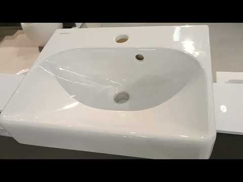Keramični umivalnik z odprtino za armaturo na sredini v beli barvi 45 x 36 x 16 cm pravokotni. S prelivom. Brez armature in sifona, montažni set je treba dokupiti. Lahko se namesti kot nadpultni (priporočamo omarice Geberit Smyle Square) ali stenski.