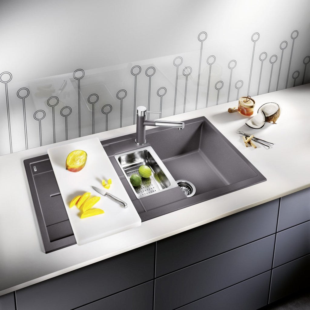 Dvojno kuhinjsko pomivalno korito iz umetnega kamna (Silgranit® PuraDur® - 80% naravnega granitа). Ustreza za vgradnjo v omarico 600 mm.