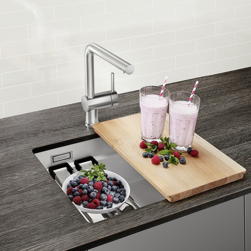 Elegantna in funkcionalna deska za rezanje iz visokokakovostnega bukovega lesa, zasnovana posebej za uporabo na kuhinjskem koritu in zagotavlja dodaten delovni prostor za pripravo hrane. Zahvaljujoč posebnemu robu lahko desko za rezanje vodite na primer vzdolž notranje stene pomivalnega korita. To ustvari povsem novo delovno in rezalno površino nad koritom. Primerno za keramična pomivalna korita, kot tudi pomivalna korita s podpultno ali vsadno namestitvijo.