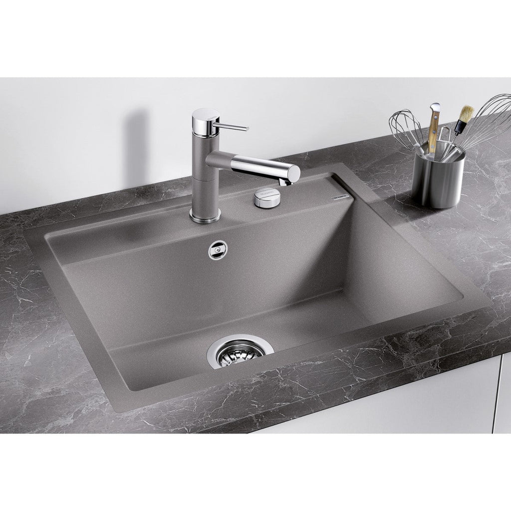 Enojno kuhinjsko pomivalno korito iz umetnega kamna (Silgranit® PuraDur® - 80% naravnega granita). Ustreza za vgradnjo v omarico 600 mm.