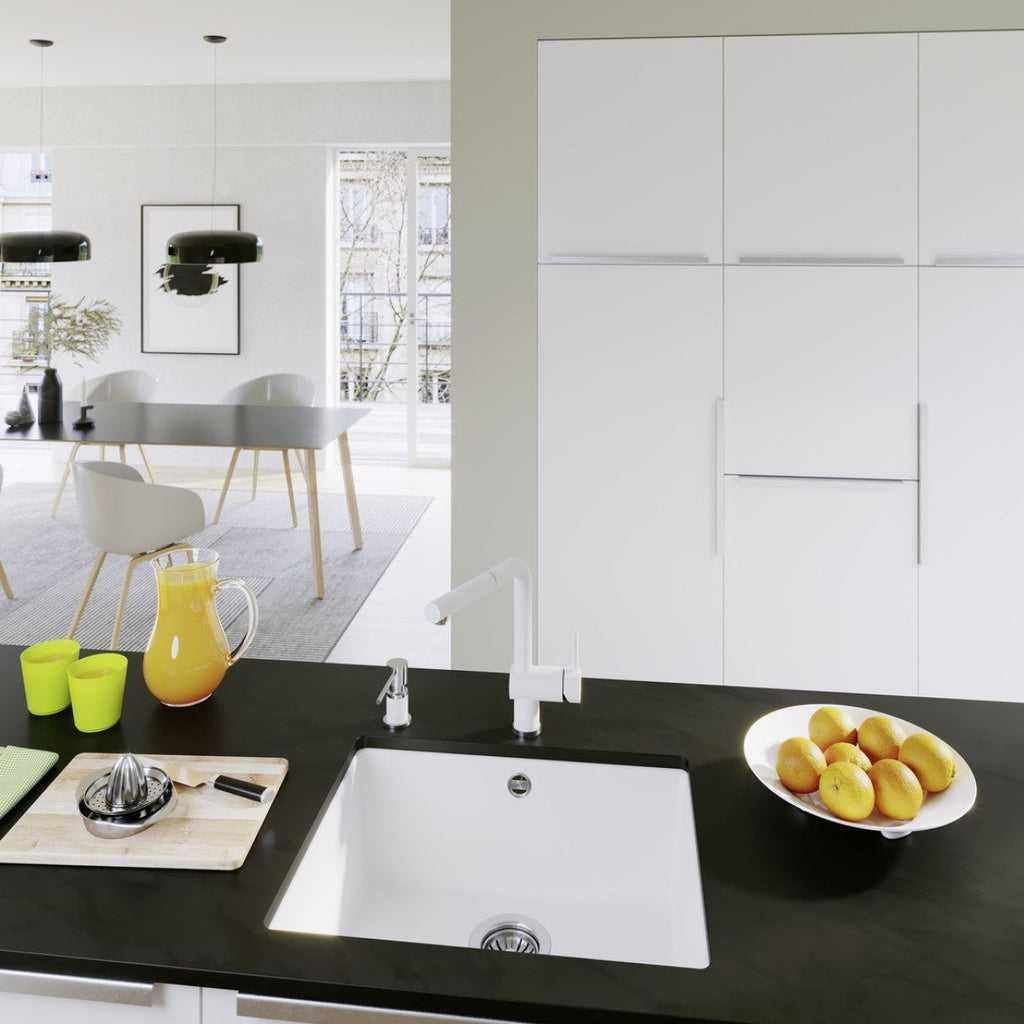 Enojno kuhinjsko pomivalno korito iz umetnega kamna (Silgranit® PuraDur® - 80% naravnega granita). Ustreza za vgradnjo v omarico 600 mm.