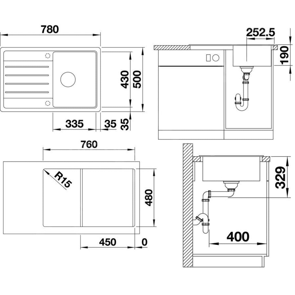 Enojno kuhinjsko pomivalno korito iz umetnega kamna (Silgranit® PuraDur® - 80% naravnega granita). Ustreza za vgradnjo v omarico 450 mm.