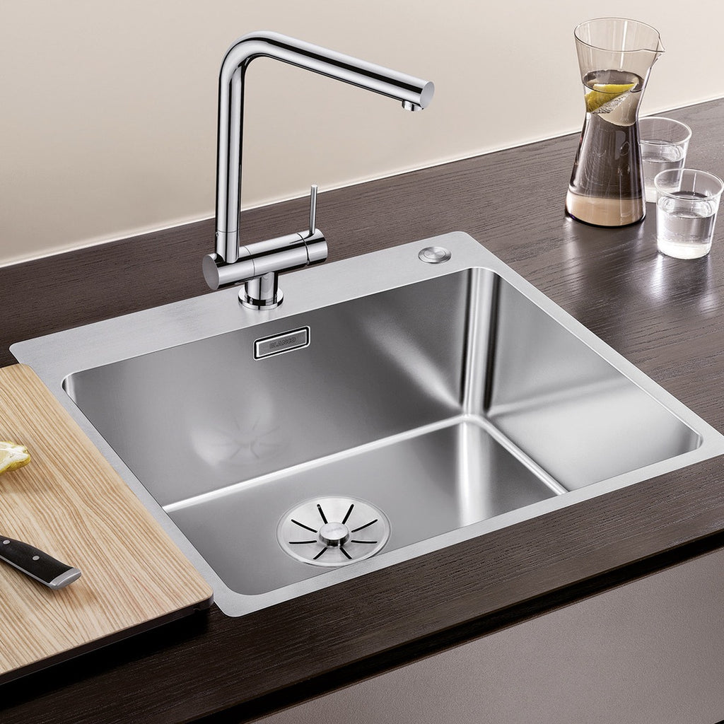 Enojno kuhinjsko pomivalno korito iz nerjavnega jekla. Z daljinskim upravljalnikom za odtok "PushControl". Ustreza za vgradnjo v omarico od 600 mm.