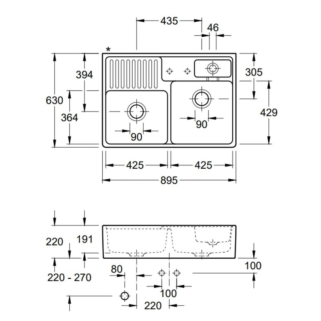Dvojno keramično pomivalno korito v beli barvi, demenzije 895 x 630 x 220 mm, pravokotno. Zgornji del sifona je zajet v kompletu.