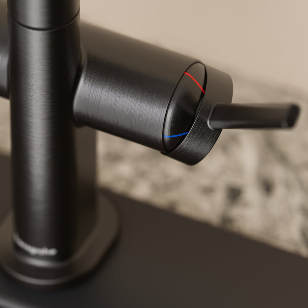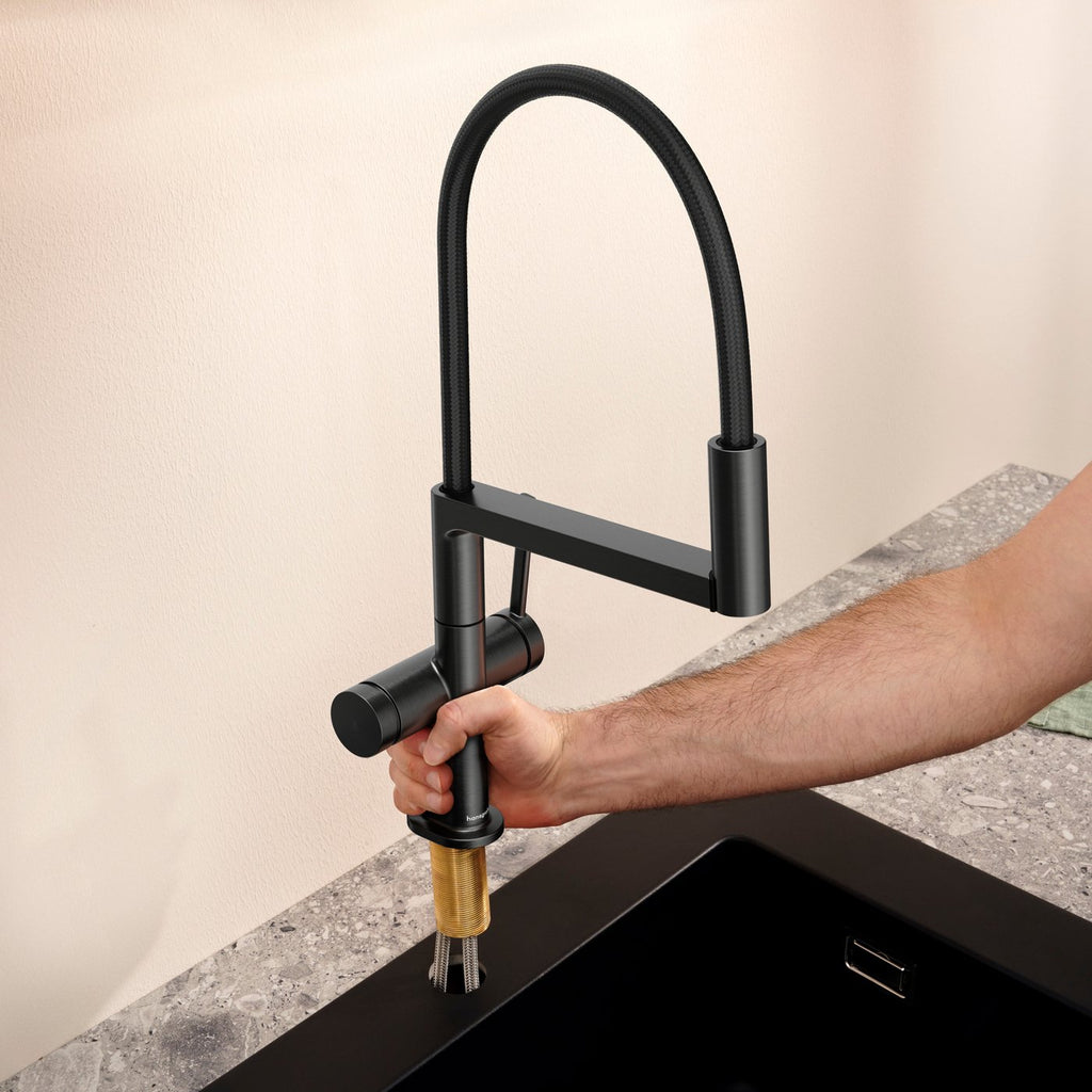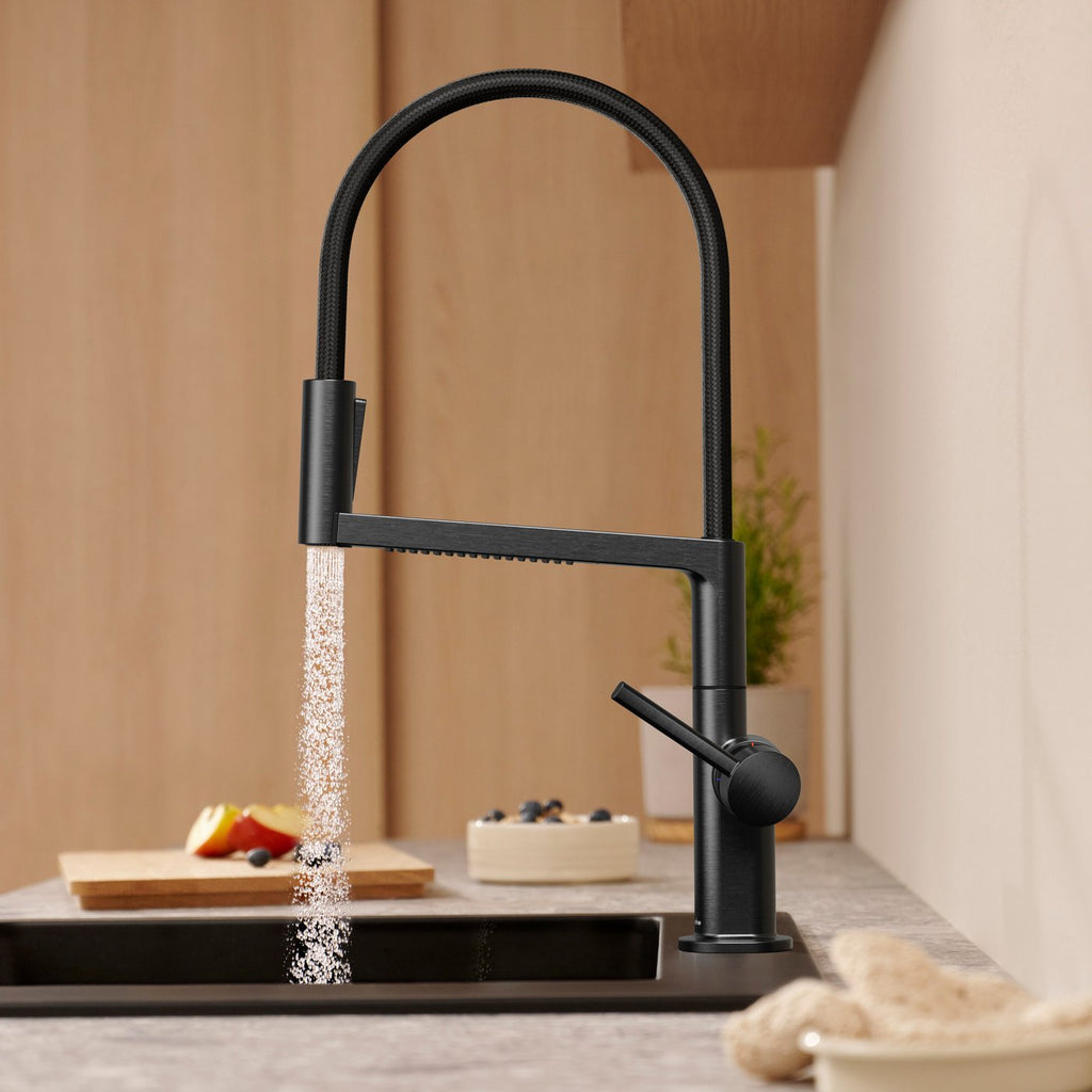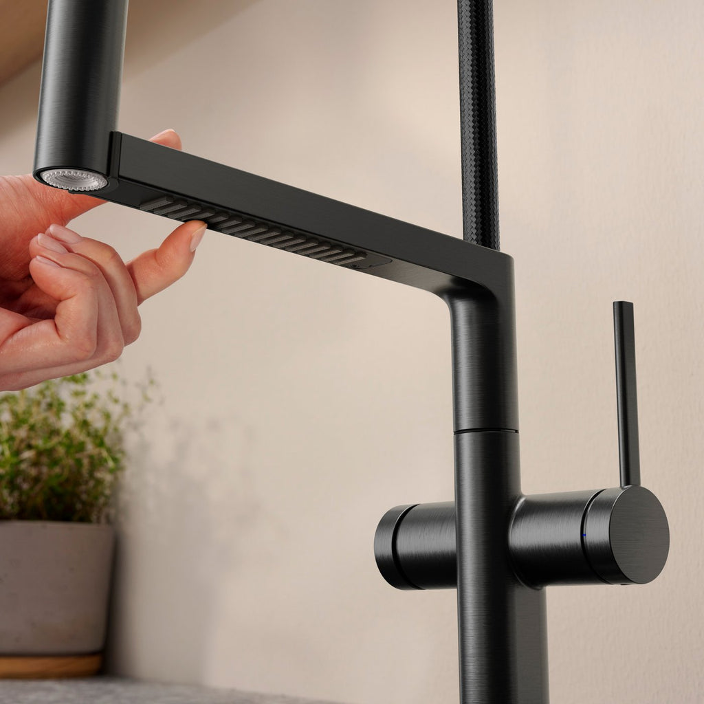 Visoka enoročna vrtljiva (do 360°) armatura za kuhinjo, stoječa, z ročajem in gumbom "Select".