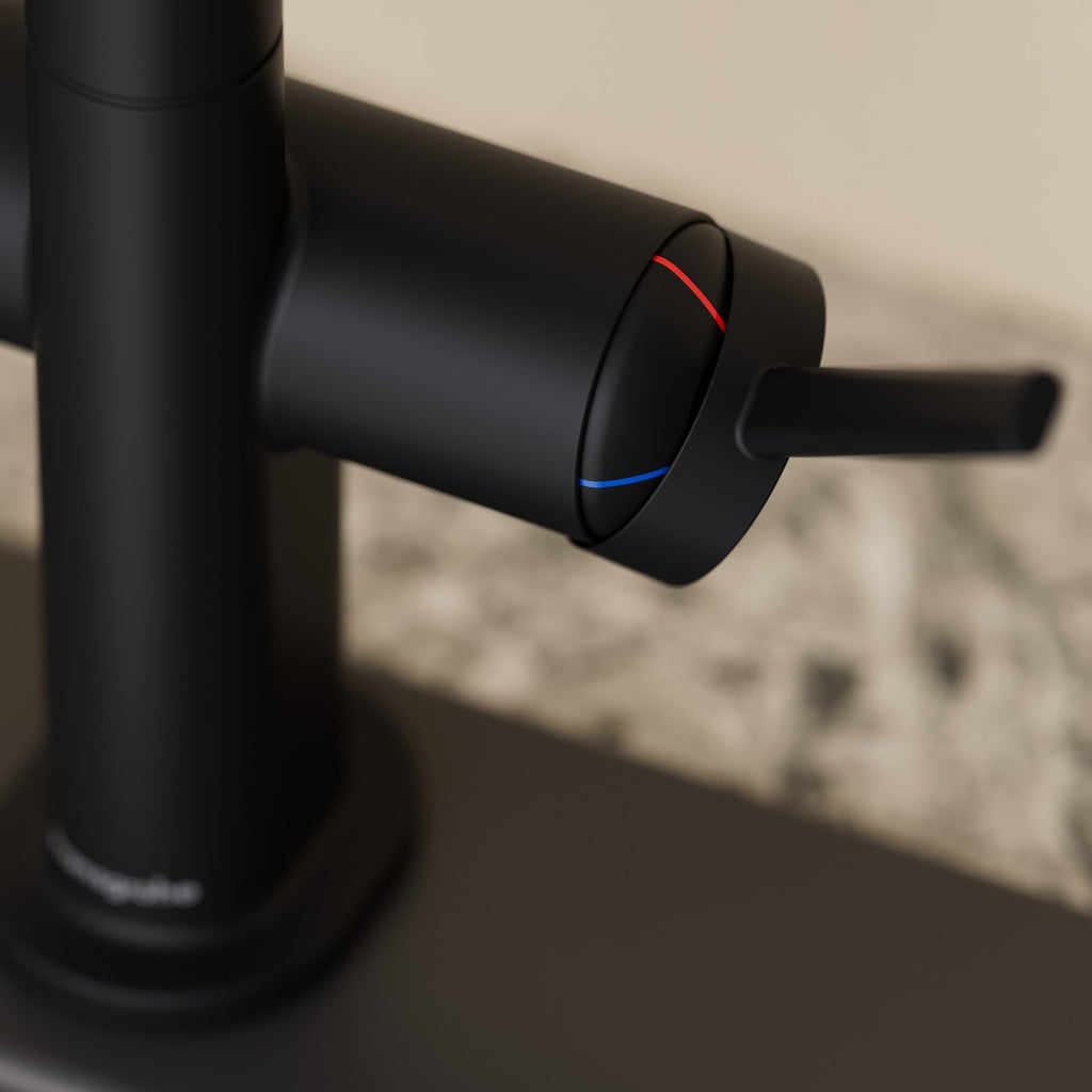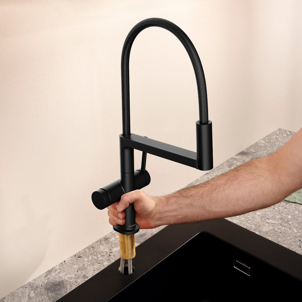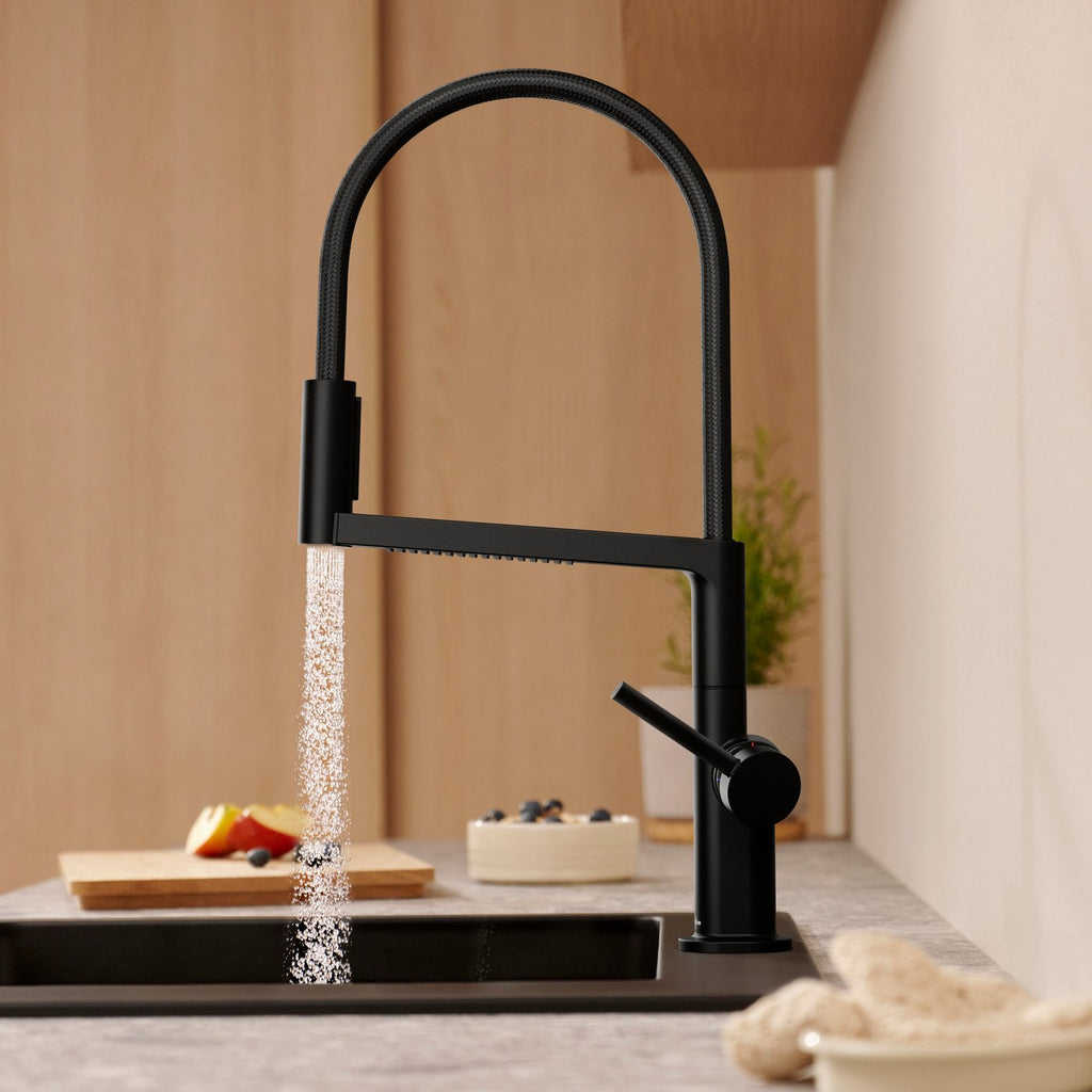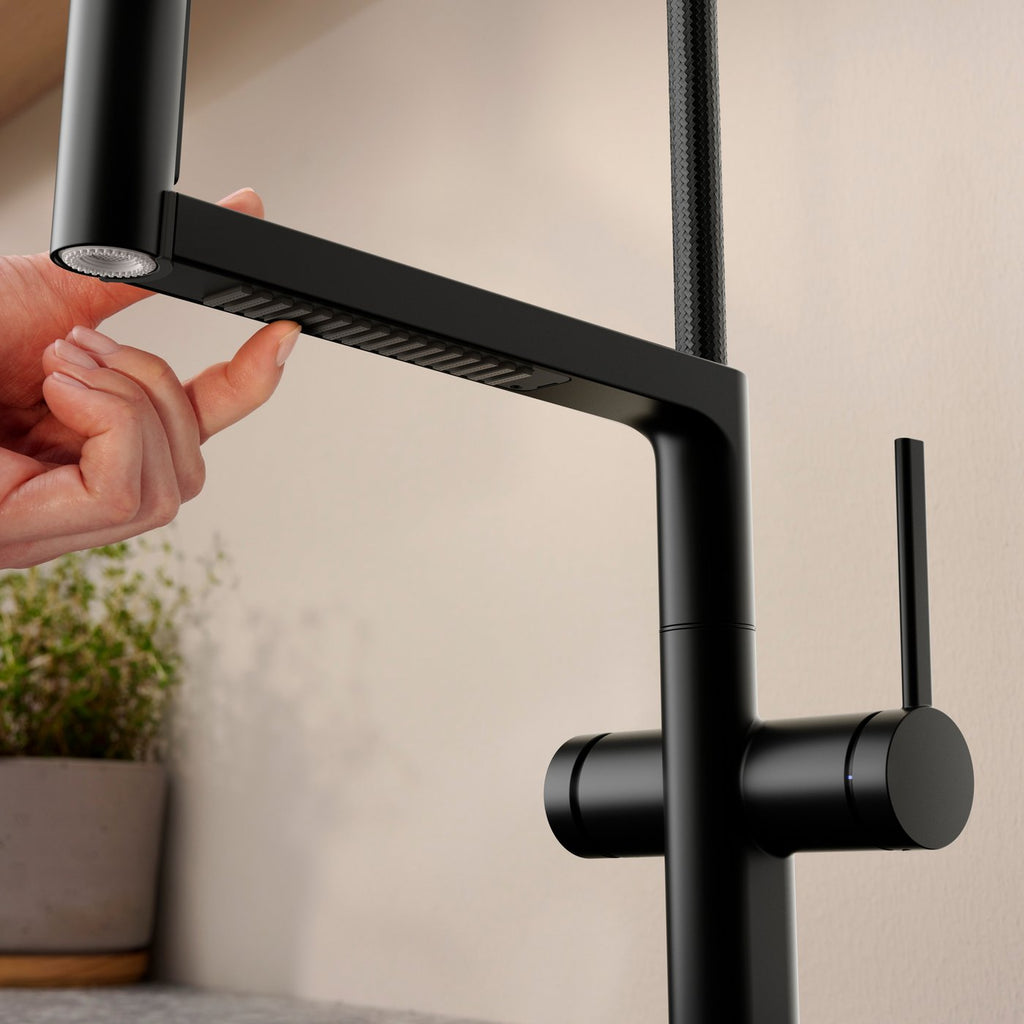 Visoka enoročna vrtljiva (do 360°) armatura za kuhinjo, stoječa, z ročajem in gumbom "Select".