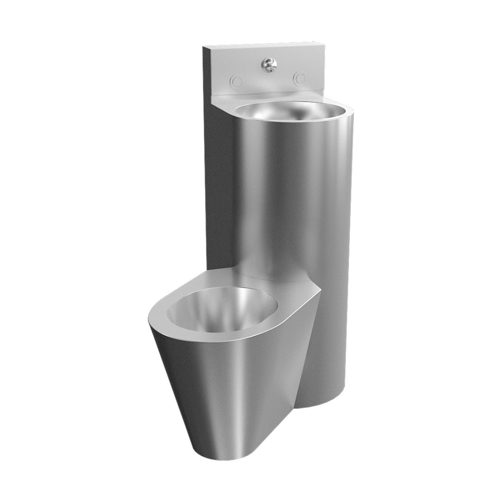 Protivandalna kotna kombinirana enota iz nerjavnega jekla s stoječo WC školjko s sistemom splakovanja, integriranim umivalnikom in vgrajeno armaturo za umivalnik. Montažni set je priložen. Brez možnosti namestitve WC deske.