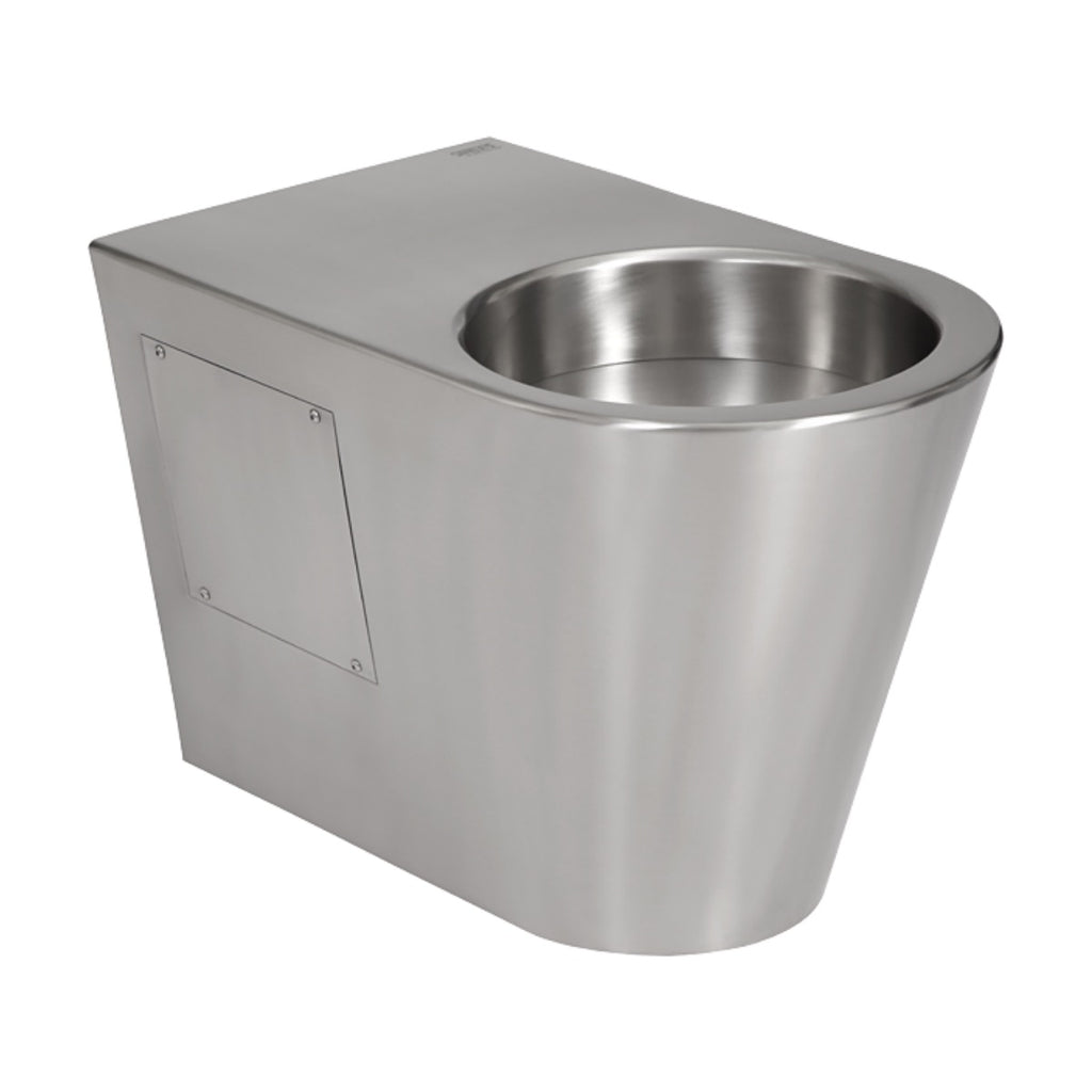 Stoječa WC školjka antivandalske izvedbe iz nerjavnega jekla. Montažni set je priložen. Brez možnosti namestitve WC deske.