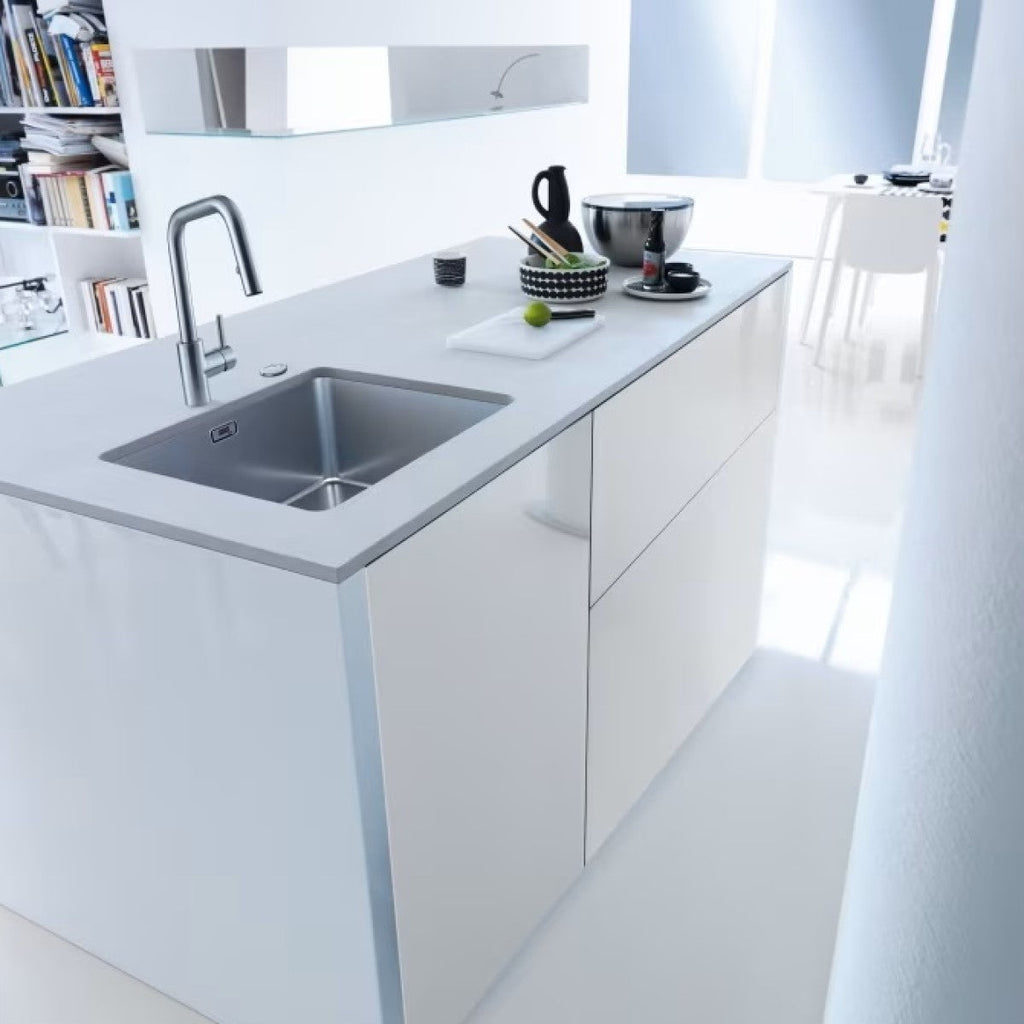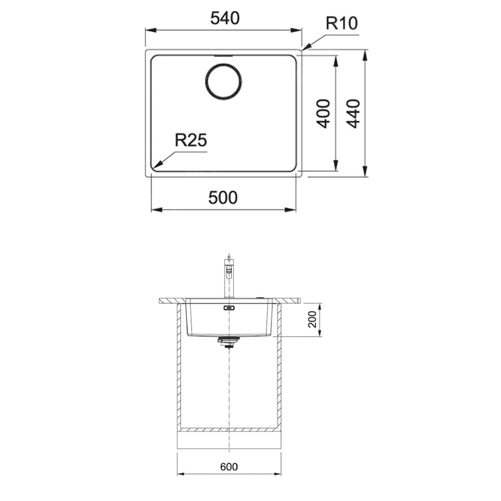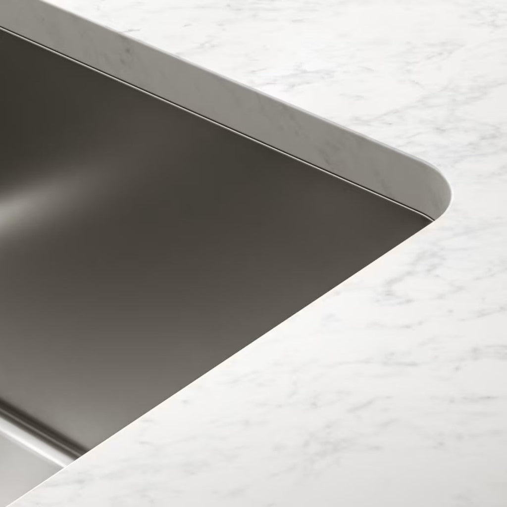 Kuhinjsko pomivalno korito iz nerjavnega jekla. Ustreza za vgradnjo v omarico 600 mm.