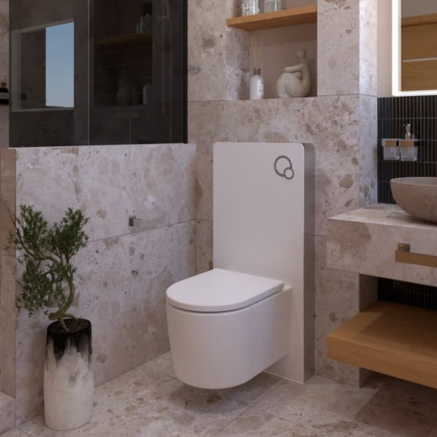 Sanitarni modul s prednjo ploščo iz varnega stekla bele barve je idealna rešitev za obnovitev kopalnice brez bistvenih oblikovnih sprememb. Sanitarni modul omogoča namestitev viseče WC-školjke brez poseganja v steno in brez pomoči strokovnjaka. Zaradi samostoječe konstrukcije ga je mogoče enostavno postaviti neposredno ob steno – hitro, čisto in brez kakršnegakoli rušenja. Montaža je izjemno preprosta: modul priključite na vodovod in odtok, pritrdite WC-školjko in sistem je pripravljen za uporabo.