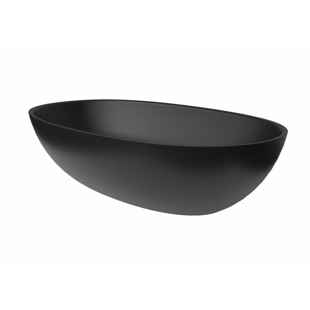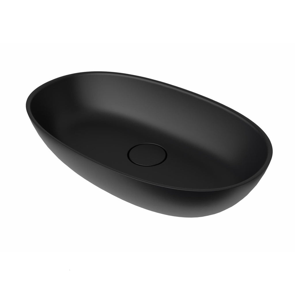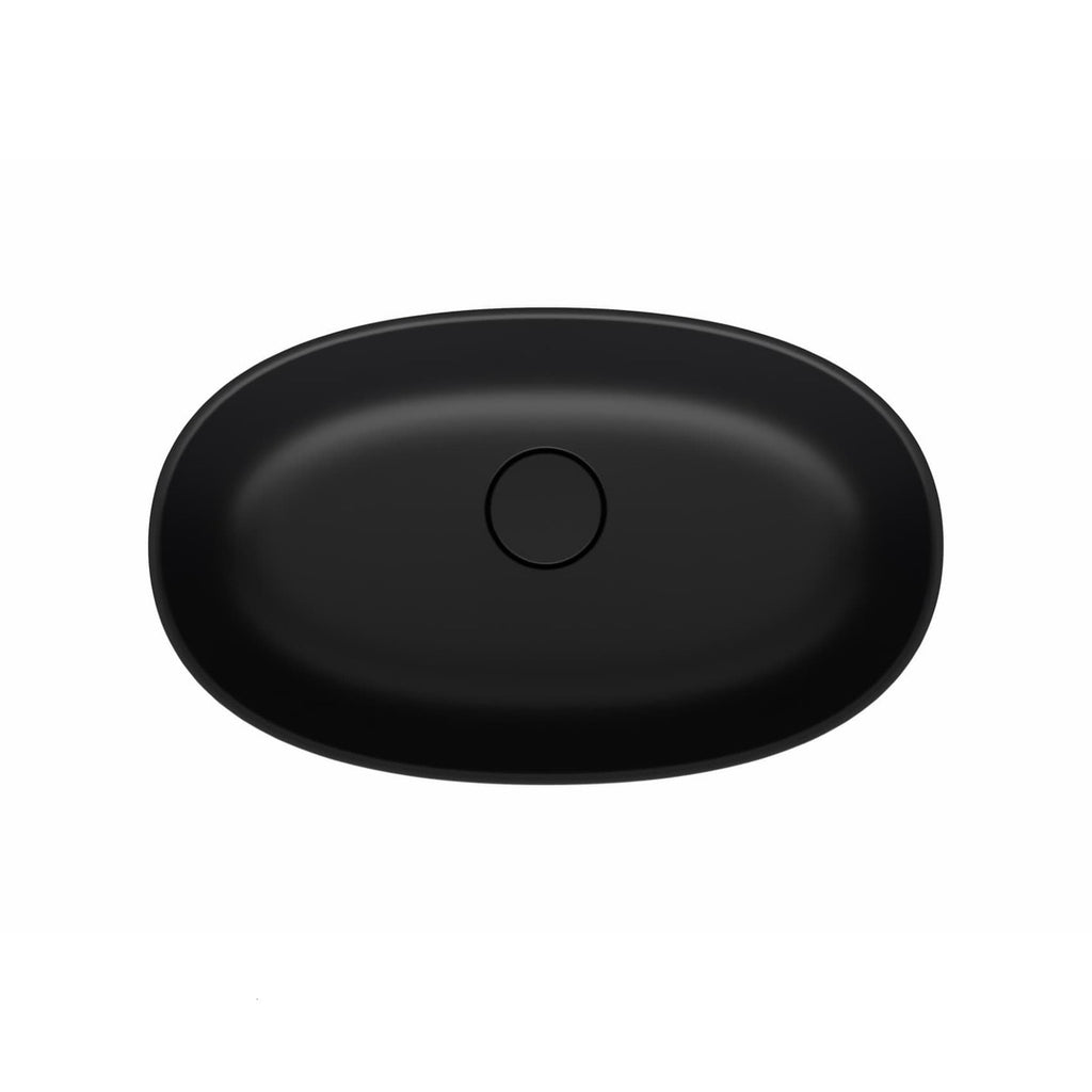 Nadpultni umivalnik iz litega marmorja črne barve z mat zaključkom 60 x 36 x 16 cm ovalni. Brez odprtine za armaturo in brez preliva. Keramični čep je zejet v kompletu. Zgornji del sifona 1315.60 ali E847 je treba dokupiti.