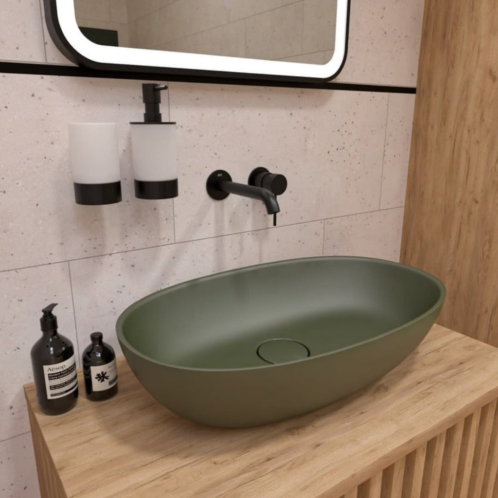 Nadpultni umivalnik iz litega marmorja v zeleni barvi z mat zaključkom 60 x 36 x 16 cm ovalni. Brez odprtine za armaturo in brez preliva. Keramični čep je zejet v kompletu. Zgornji del sifona 1315.60 ali E847 je treba dokupiti.