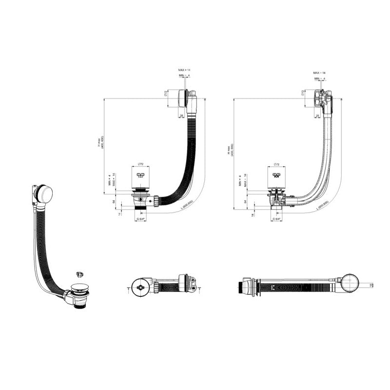 Prelivna garnitura s sifonom za kopalne kadi standardnih velikosti (do 80 cm razdalja med odtokom in prelivno odprtino) in odprtino ventila Ø 52 mm. Komplet zajema sifon z vrtljivim kolenom za iztok 40 in 50 mm.