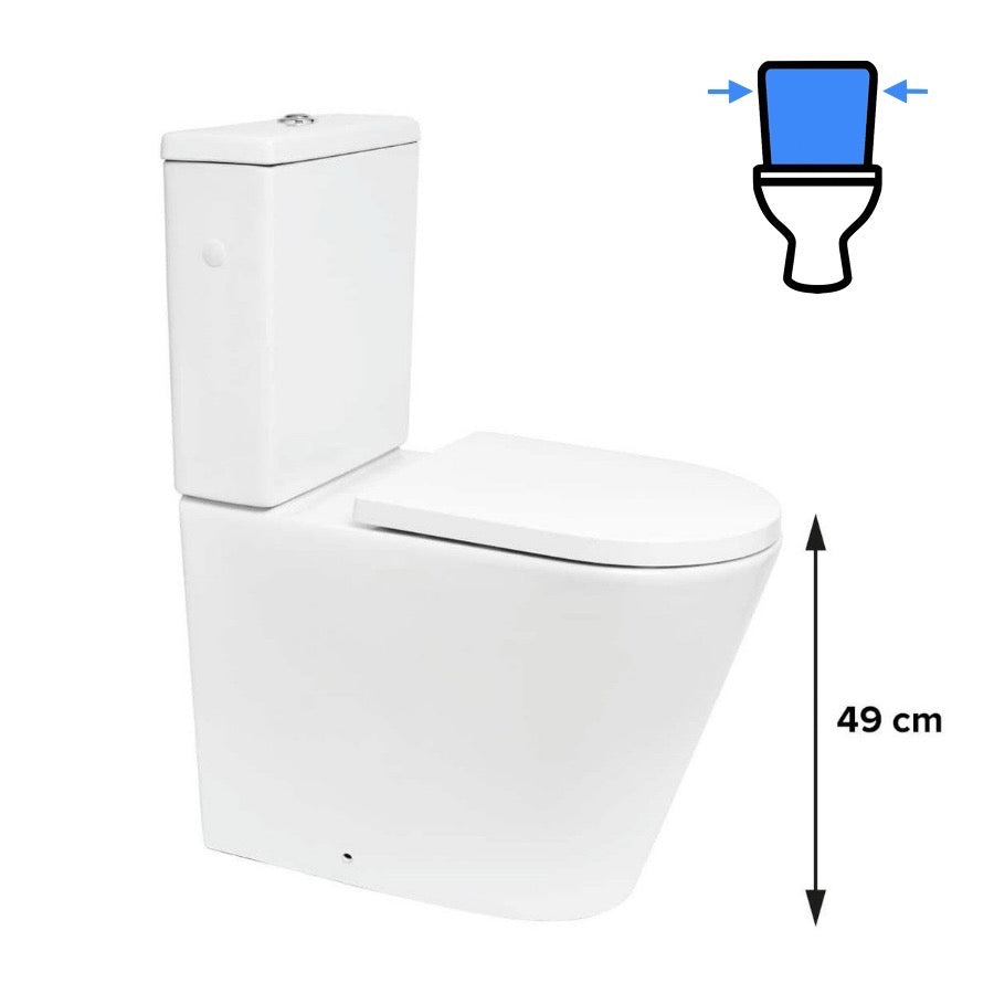 Talna stoječa brezrobna WC školjka monoblok z WC desko s počasnim zapiranjem "Soft Close". Višja izvedba - višina školjke z WC desko 490 mm.