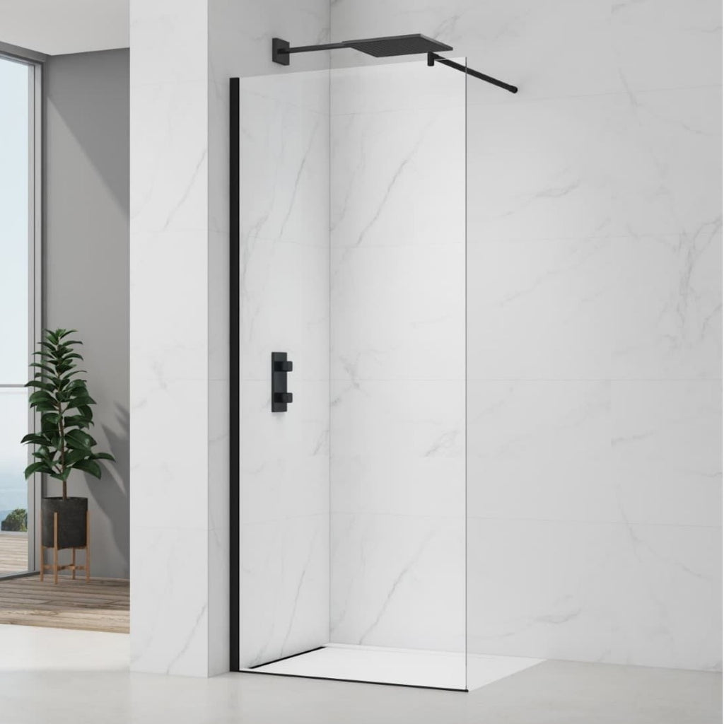 Steklena stena oz. odpta tuš kabina Walk-in s prozornim steklom in profili črne barve. Kaljeno varnostno prozorno steklo 6 mmEasyClean obdelavo proti nabiranju vodnega kamna. Walk-in tuš stena se lahko montira na tuš kad ali direktno na tla. Tuš kad ni zajeta v kompletu.