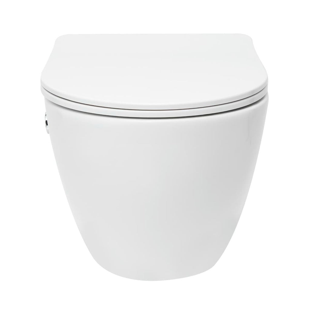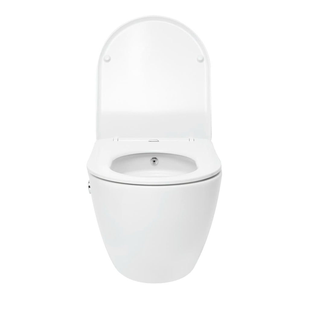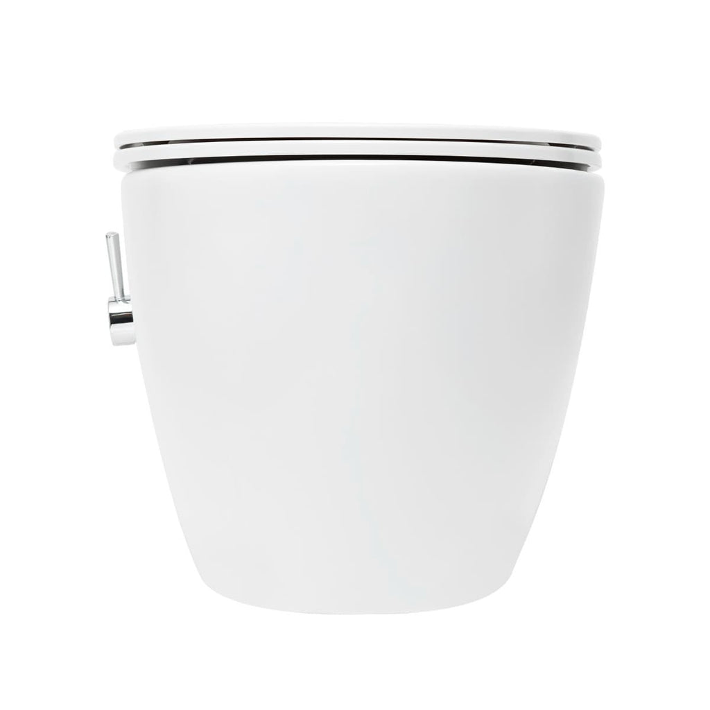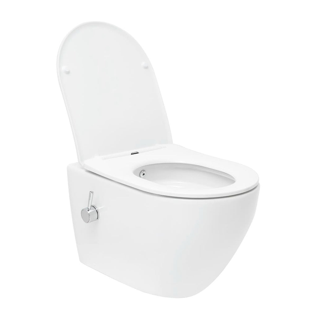 Viseča WC školjka brez roba z inovativnim sistemom splakovavja "TORNADO" v kompletu z WC desko s počasnim zapiranjem "Soft Close" in bide funkcijo. Električna povezava ni potrebna. WC školjko se da priključit na toplo in hladno vodo ali samo na hladno vodo. Upravljanje funkcije bideja se nahaja na desni strani, kjer je nameščena armatura za prilagajanje pretoka in temperature vode. Šoba se ne premakne.