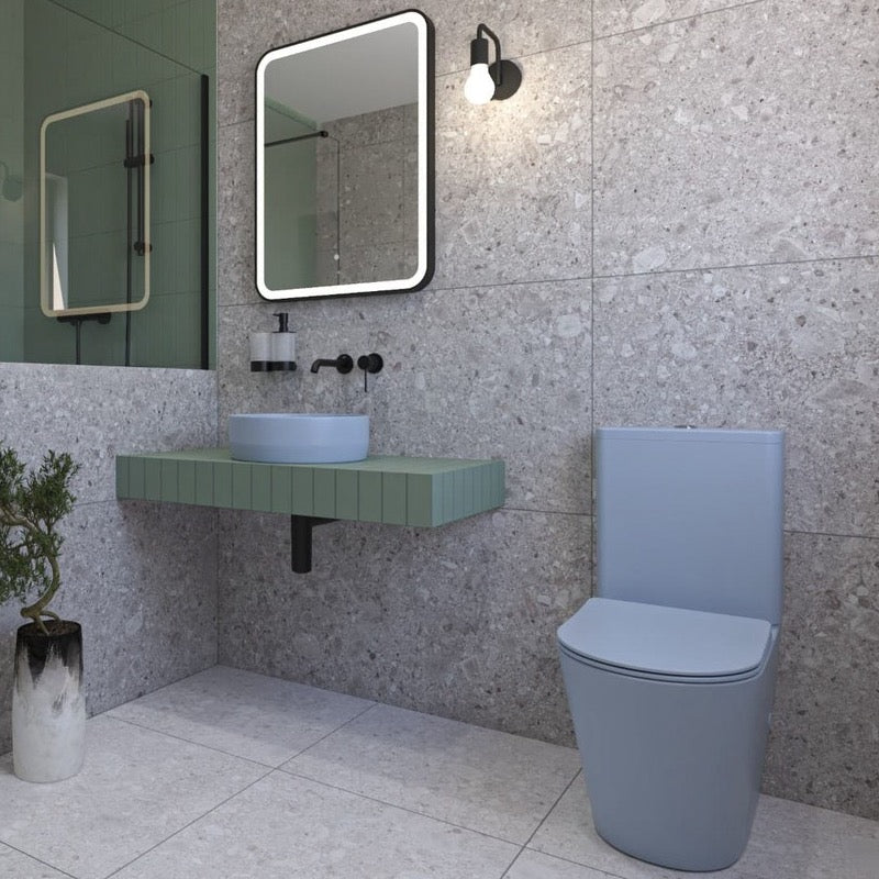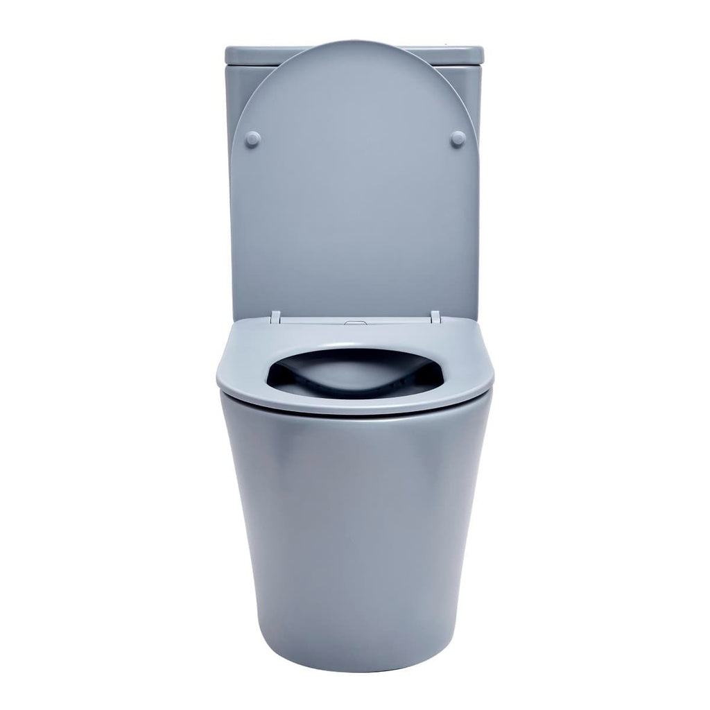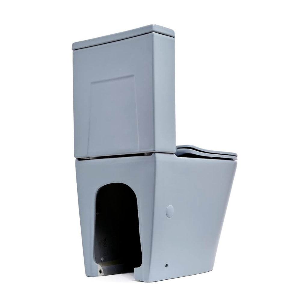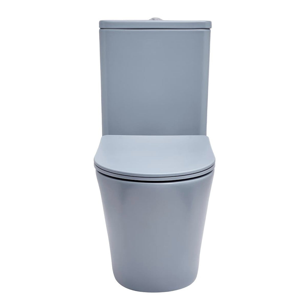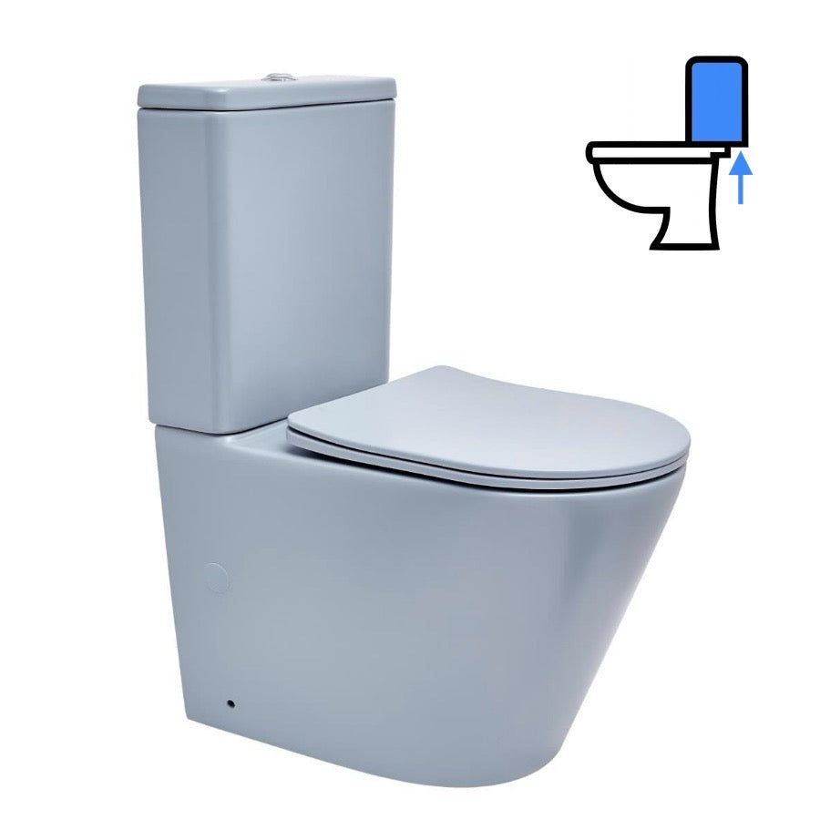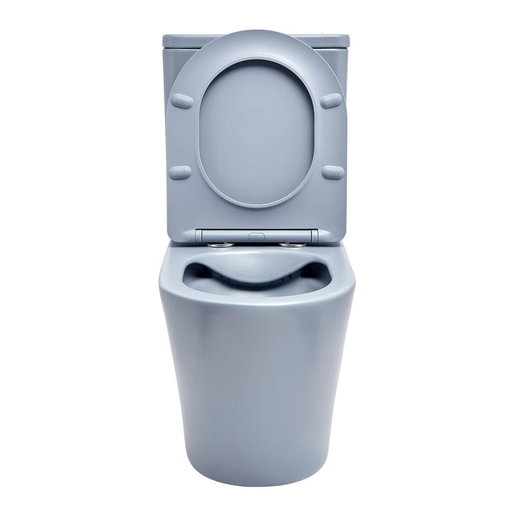 Talna stoječa brezrobna WC školjka monoblok modre barve z mat zaključkom, z WC desko s počasnim zapiranjem "Soft Close". DOVOD VODE V KOTLIČEK OD SPODAJ  (SKRITI DOVOD VODE) 3/8"