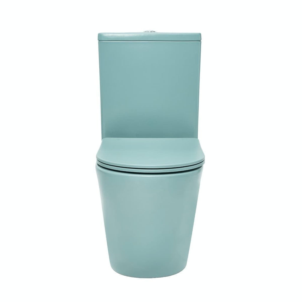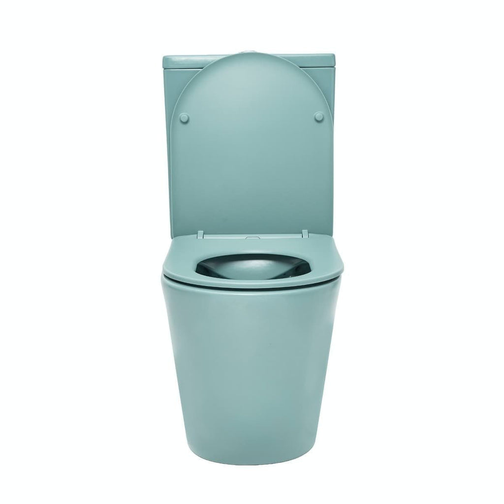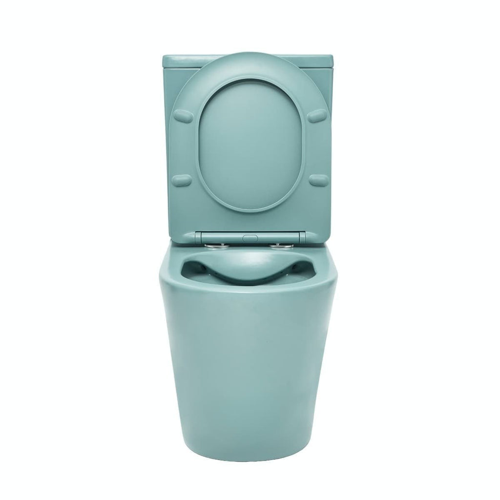 Talna stoječa brezrobna WC školjka monoblok zelene barve z mat zaključkom, z WC desko s počasnim zapiranjem "Soft Close". DOVOD VODE V KOTLIČEK OD SPODAJ  (SKRITI DOVOD VODE) 3/8"