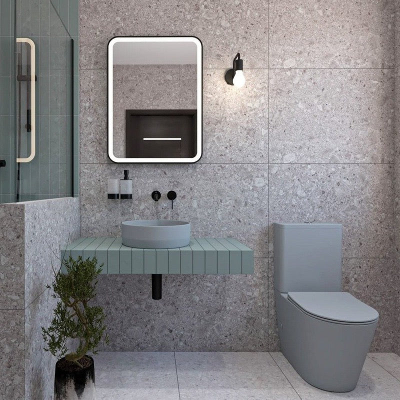 Talna stoječa brezrobna WC školjka monoblok sive barve z mat zaključkom, z WC desko s počasnim zapiranjem "Soft Close". DOVOD VODE V KOTLIČEK OD SPODAJ  (SKRITI DOVOD VODE) 3/8"