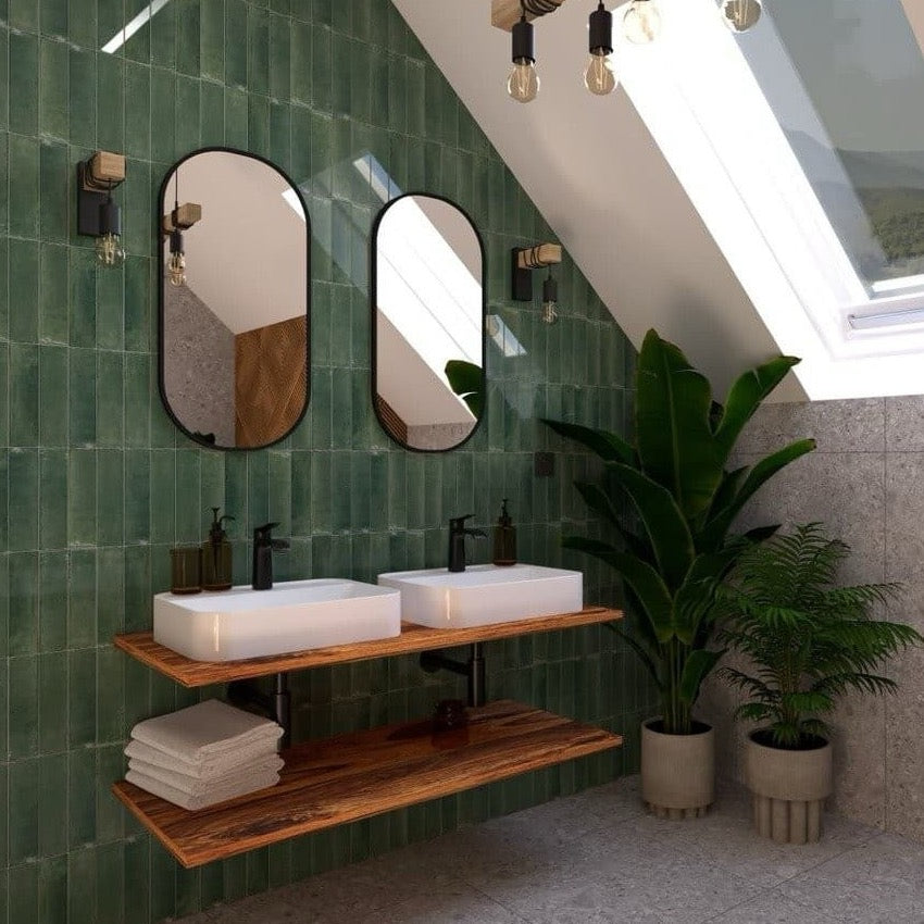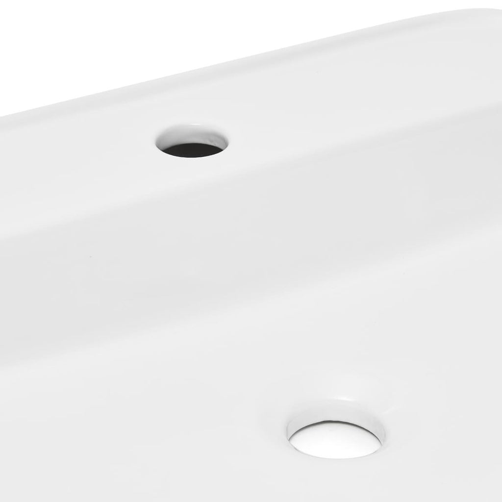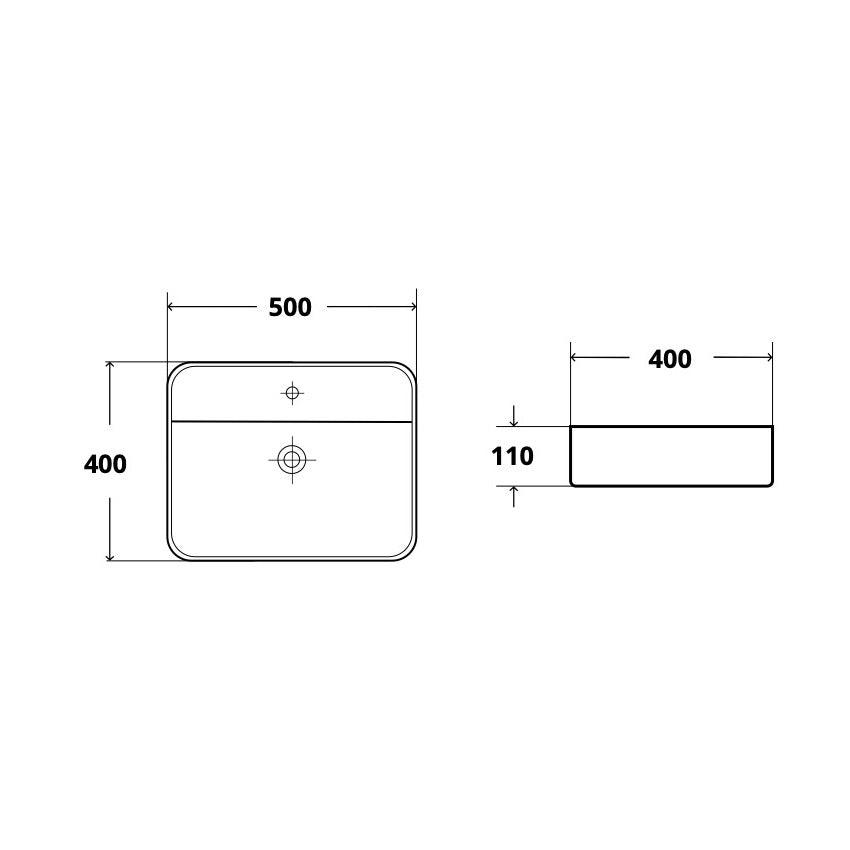 Nadpultni keramični umivalnik z odprtino za armaturo na sredini v beli barvi 50 x 40 x 11 cm z elegantnimi tankimi robovi. Brez preliva.