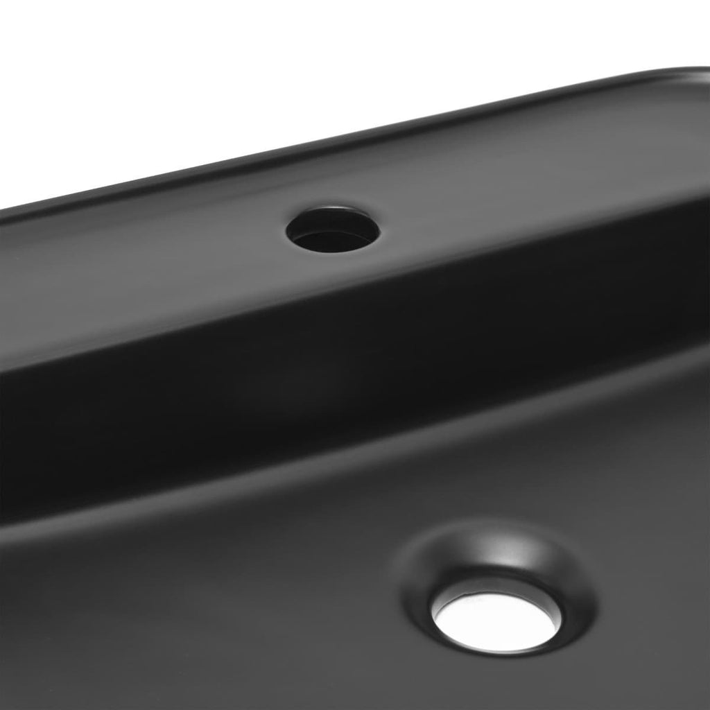 Nadpultni keramični umivalnik z odprtino za armaturo na sredini v črni barvi z mat zaključkom 50 x 40 x 11 cm z elegantnimi tankimi robovi. Brez preliva.