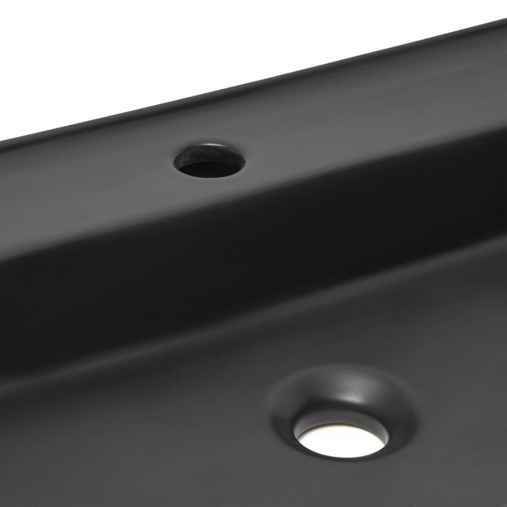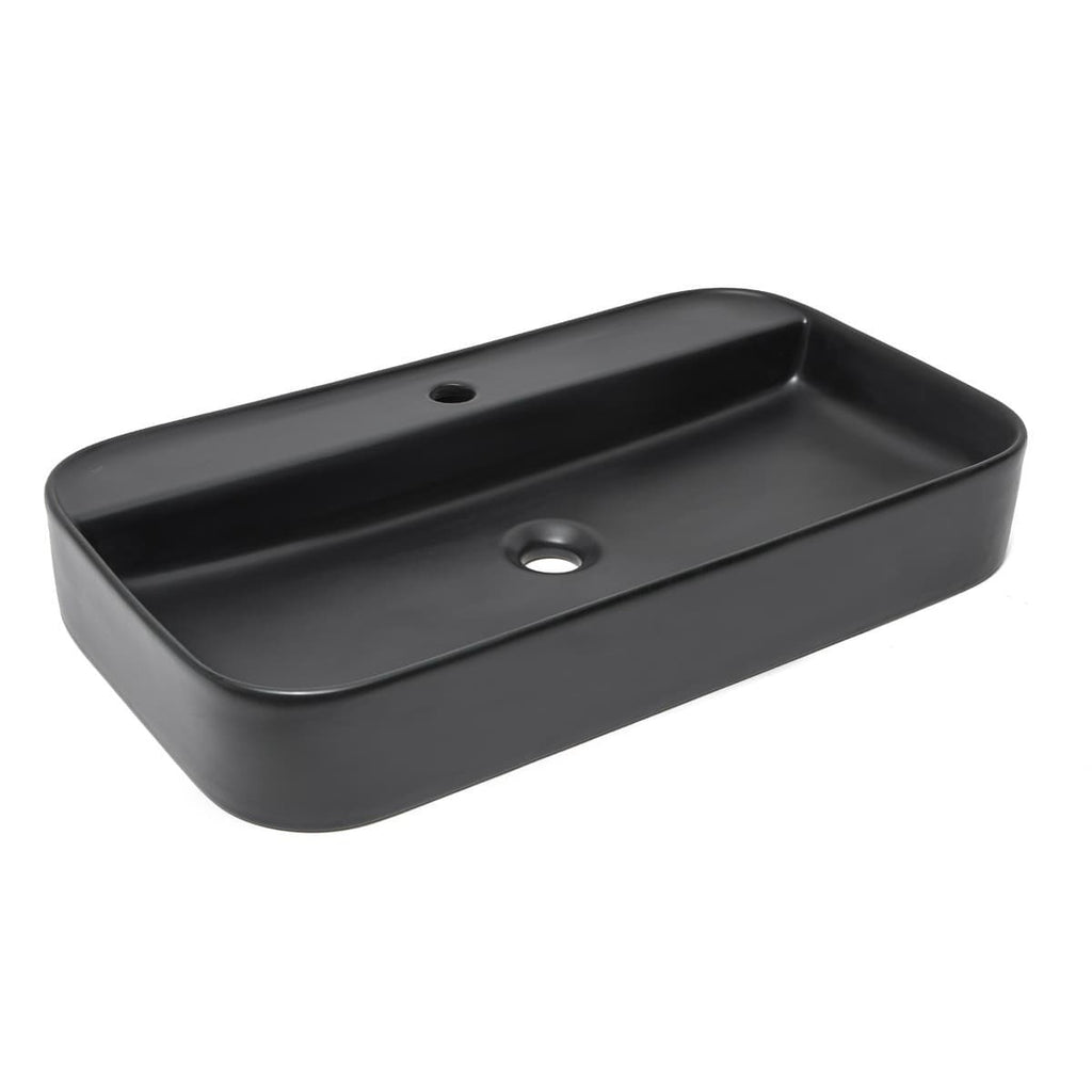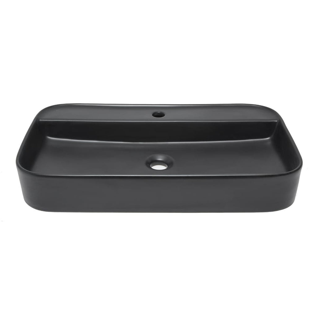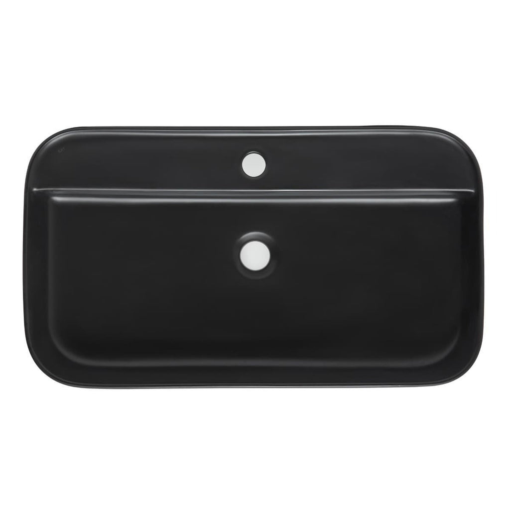 Nadpultni keramični umivalnik z odprtino za armaturo na sredini v črni barvi z mat zaključkom 70 x 40 x 11 cm z elegantnimi tankimi robovi. Brez preliva.