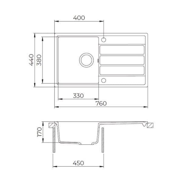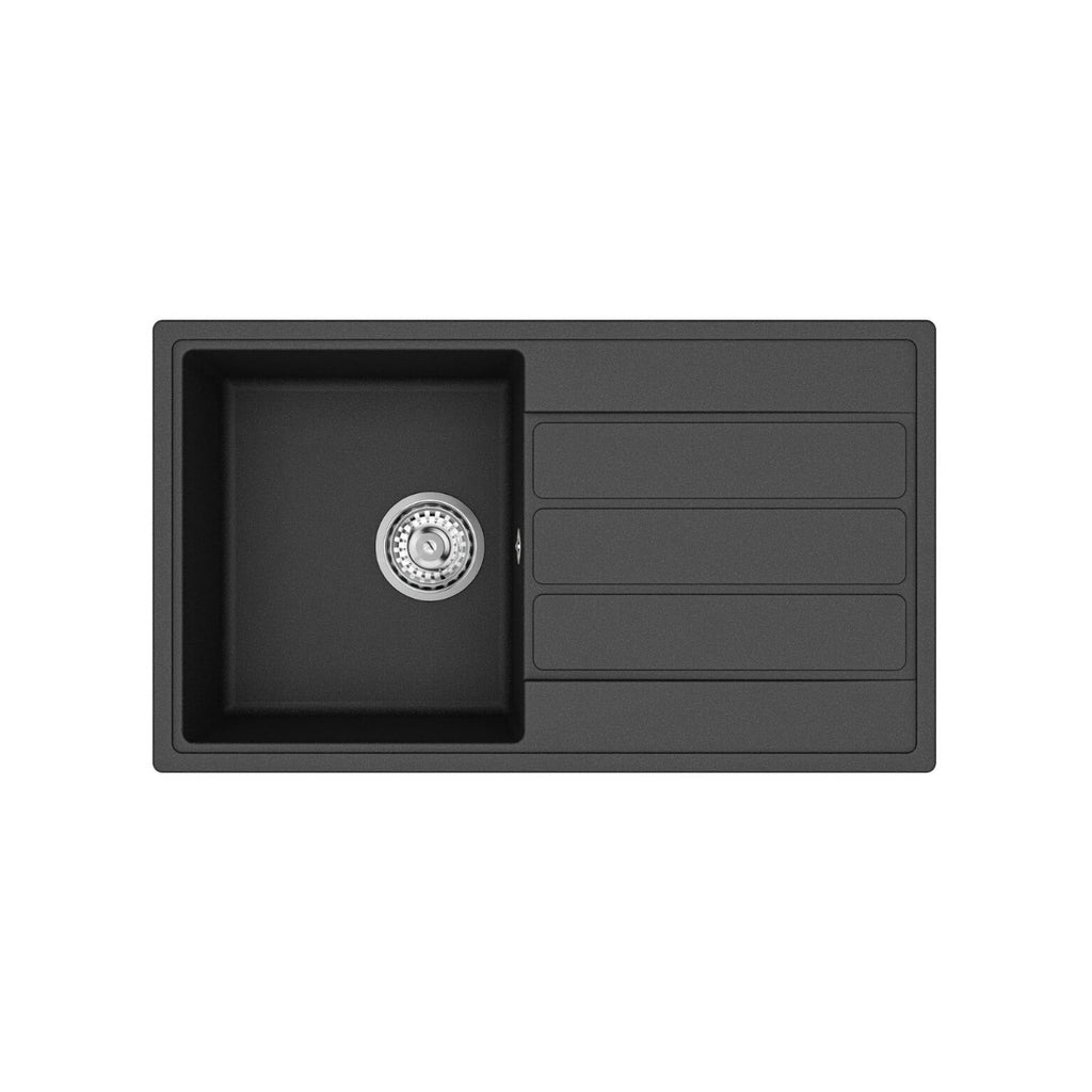 Enojno kuhinjsko pomivalno korito iz umetnega granita (80% kremenčevega peska). Primerno za vgradnjo v omarico širine 45 cm.
