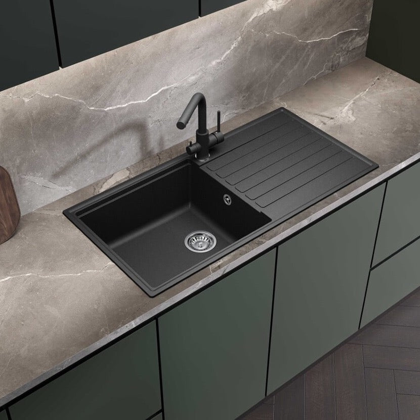 Enojno kuhinjsko pomivalno korito iz umetnega granita (80% kremenčevega peska). Primerno za vgradnjo v omarico širine 60 cm.