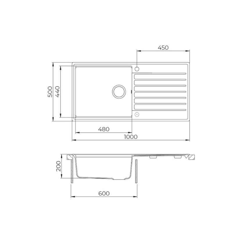 Enojno kuhinjsko pomivalno korito iz umetnega granita (80% kremenčevega peska). Primerno za vgradnjo v omarico širine 60 cm.