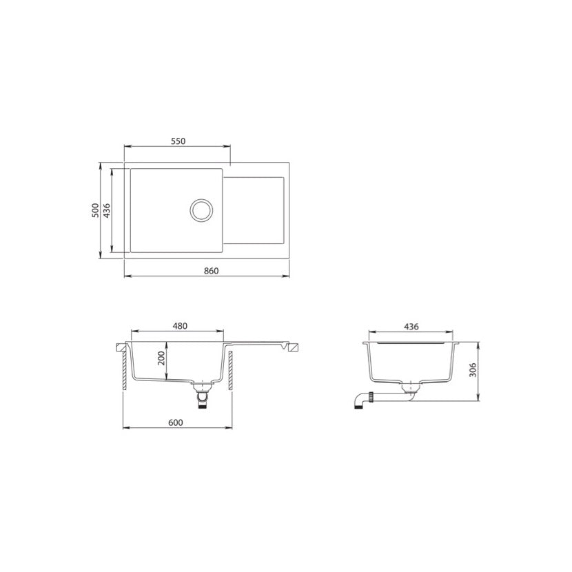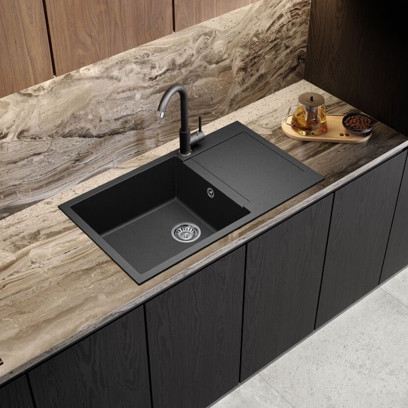 Enojno kuhinjsko pomivalno korito iz umetnega granita (80% kremenčevega peska). Primerno za vgradnjo v omarico širine 60 cm.
