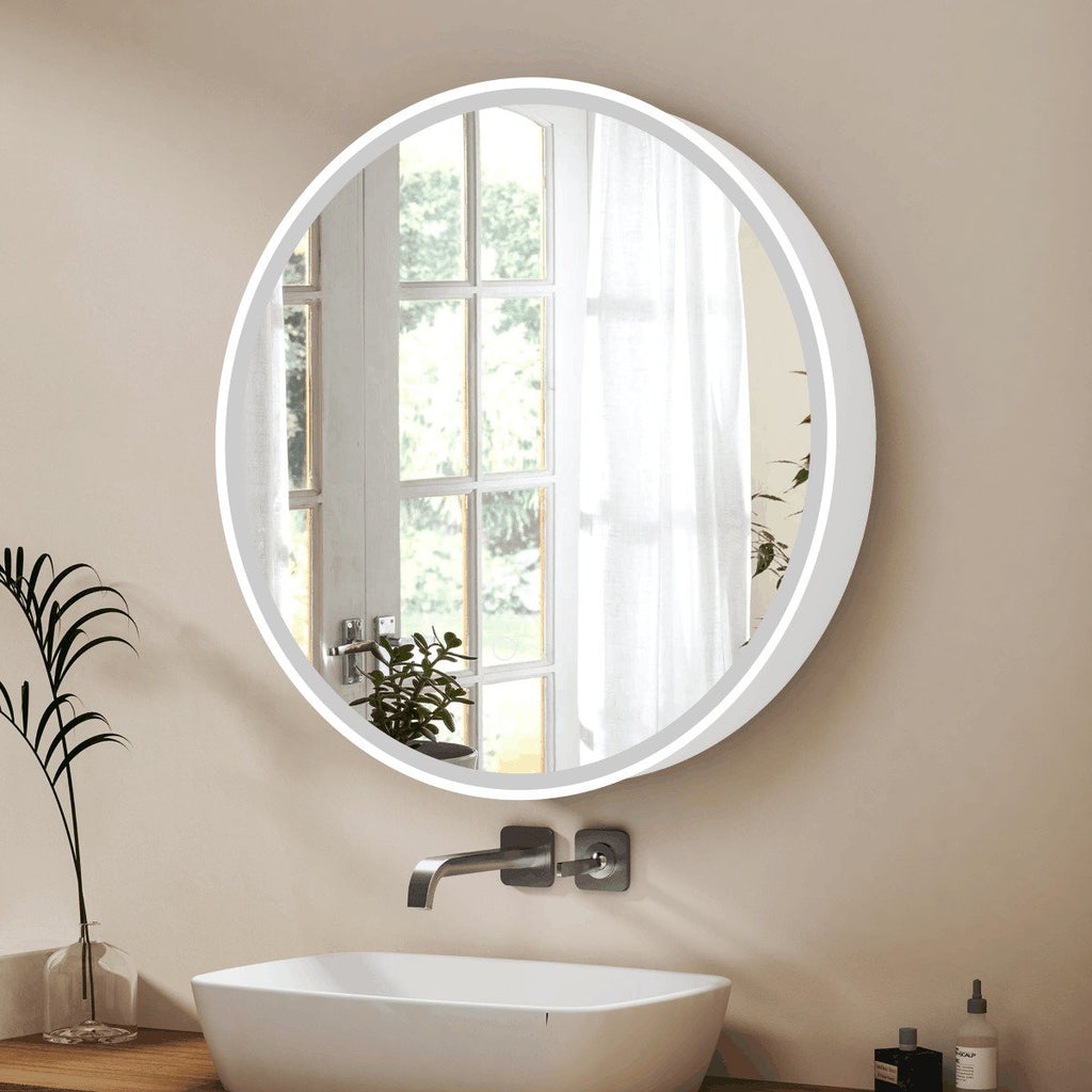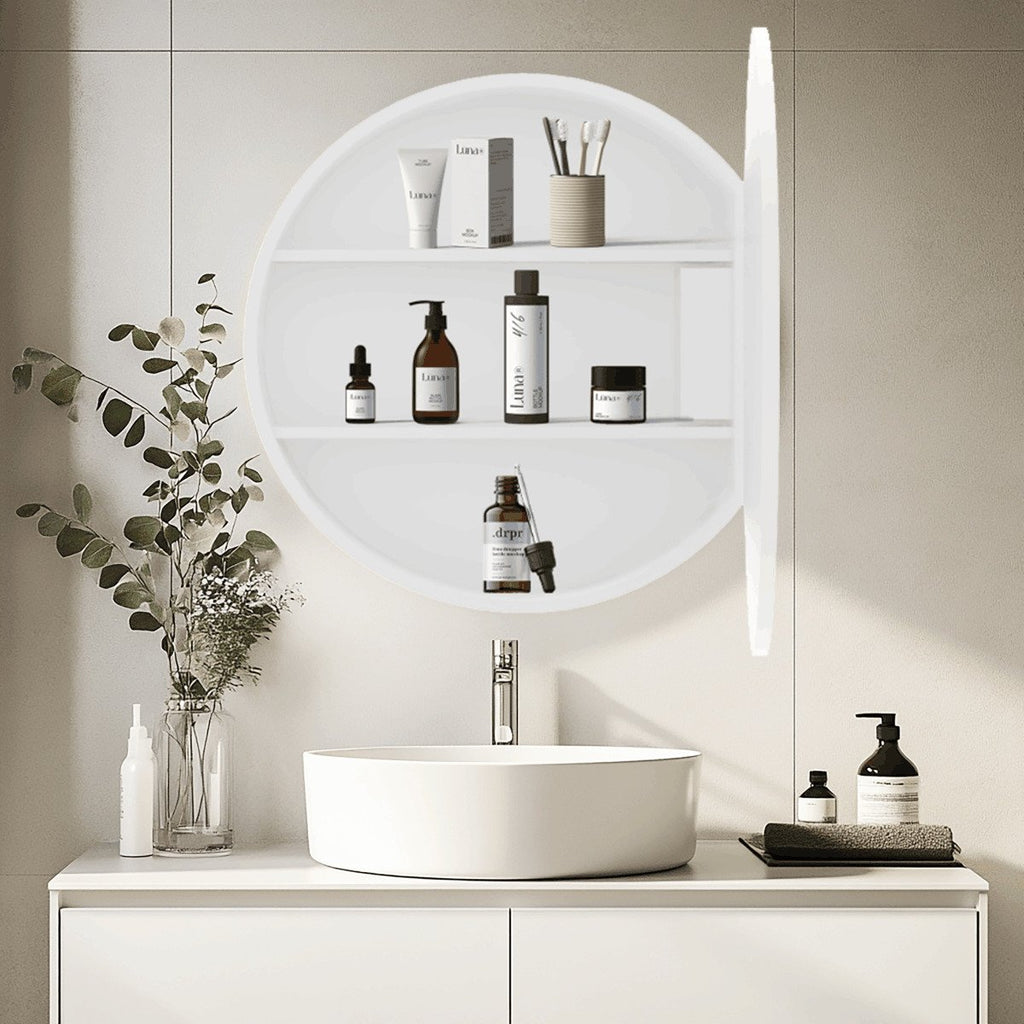 Viseča kopalniška omarica z ogledalom 60 x 60 x 12,5 bele barve, okrogla. Desno odpiranje vrat. Omarica je opremljena z LED osvetlitvijo na senzor z možnostjo izbire nevtralne, tople ali hladne barve (3000 - 6500K, 1900 lm.), IP44 zaščita pred brizganjem vode.