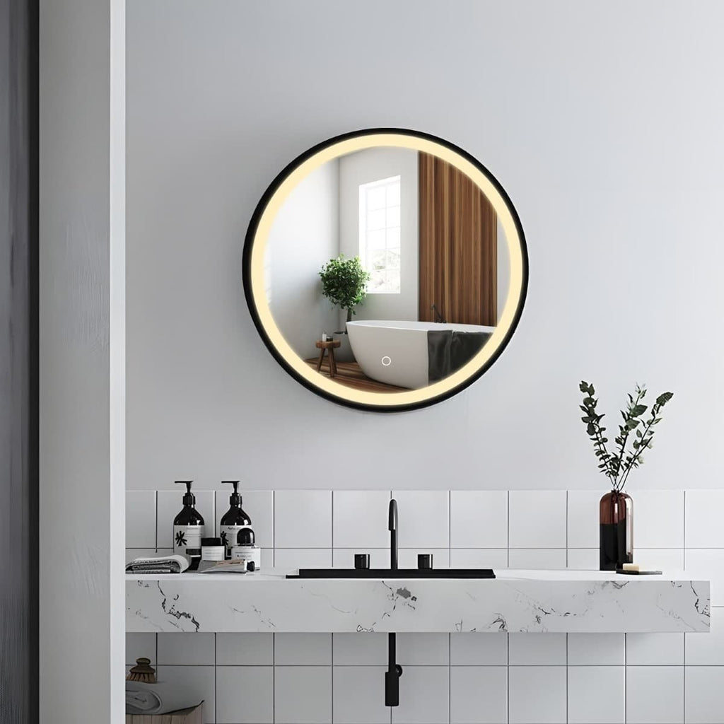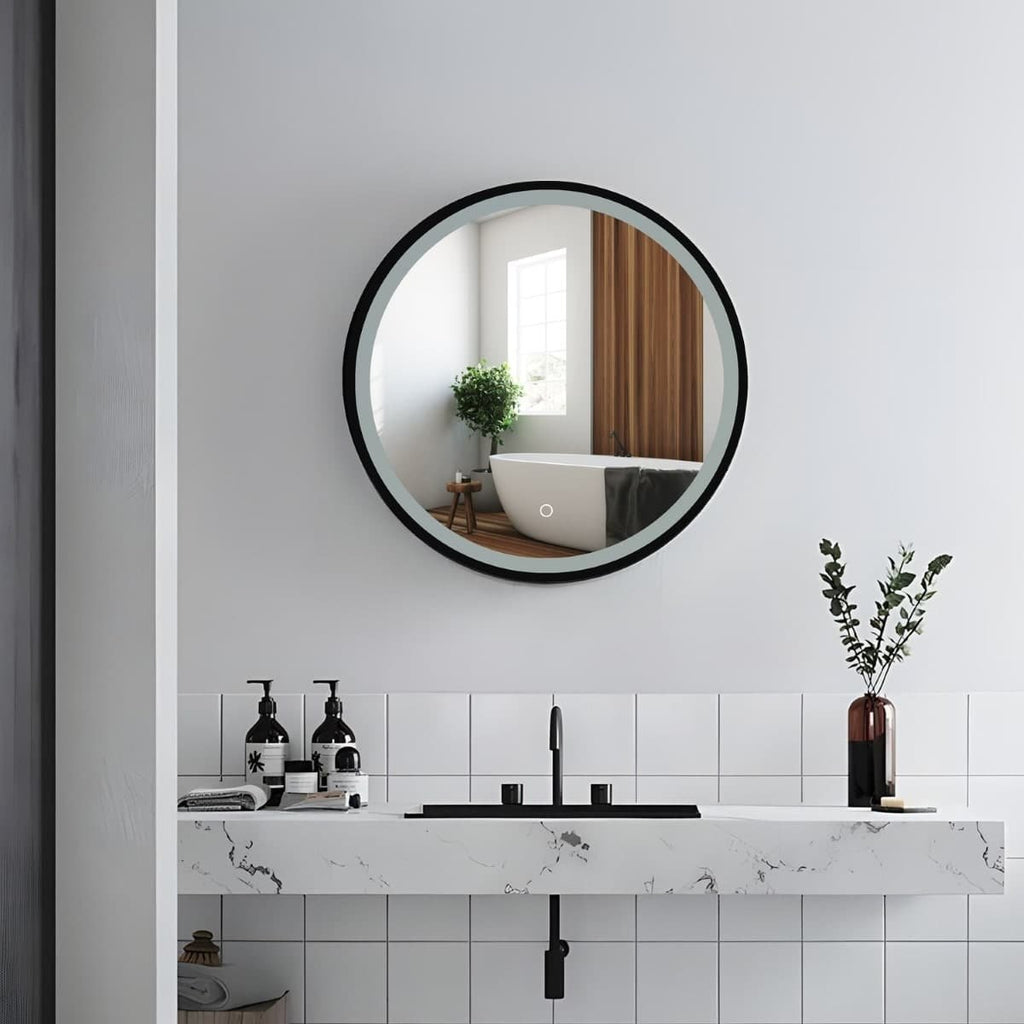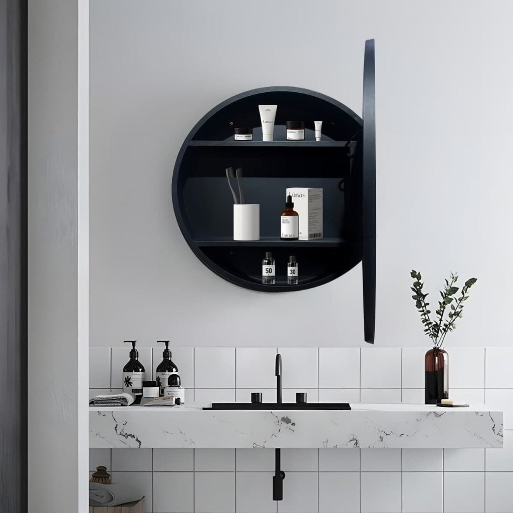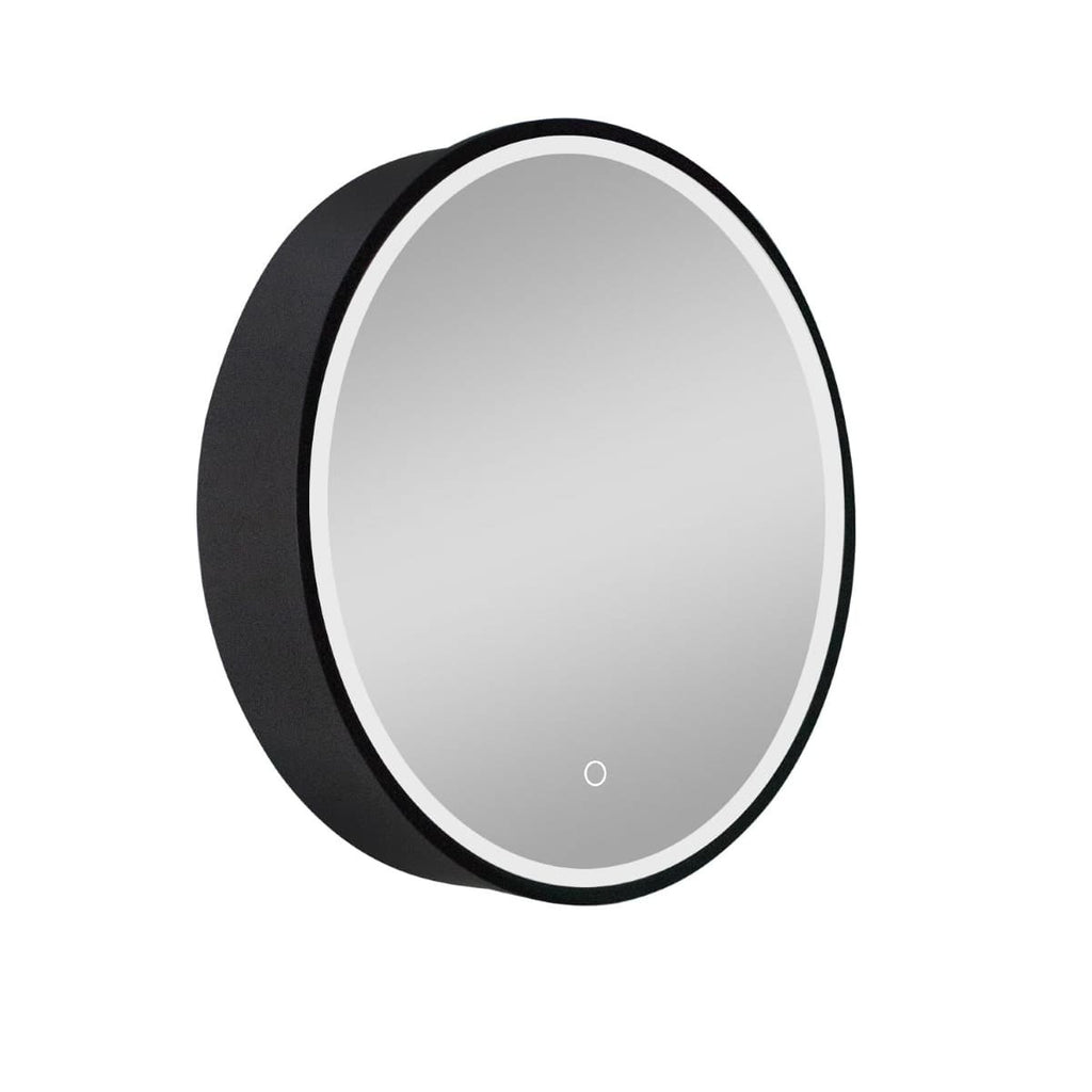 Viseča kopalniška omarica z ogledalom 60 x 60 x 12,5 črne barve, okrogla. Desno odpiranje vrat. Omarica je opremljena z LED osvetlitvijo na senzor z možnostjo izbire nevtralne, tople ali hladne barve (3000 - 6500K, 1900 lm.), IP44 zaščita pred brizganjem vode.